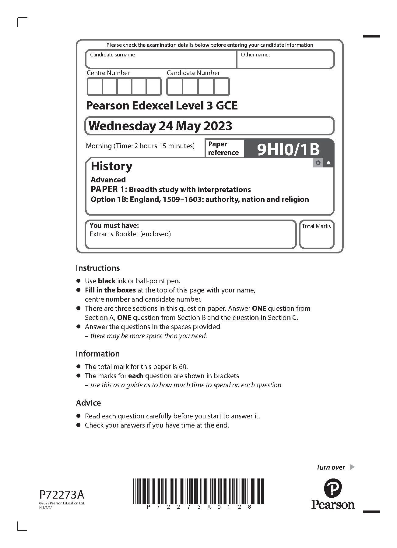 PEARSON EDEXCEL A LEVEL History PAPER 1 2023 QUESTION PAPER (9HI0/1B: England, 1509–1603: authority, nation and religion). PEARSON EDEXCEL A LEVEL History PAPER 1 2023 QUESTION PAPER (9HI0/1B: England, 1509–1603: authority, nation and religion) Pearson Edexcel A and AS Papers and Mark Schemes