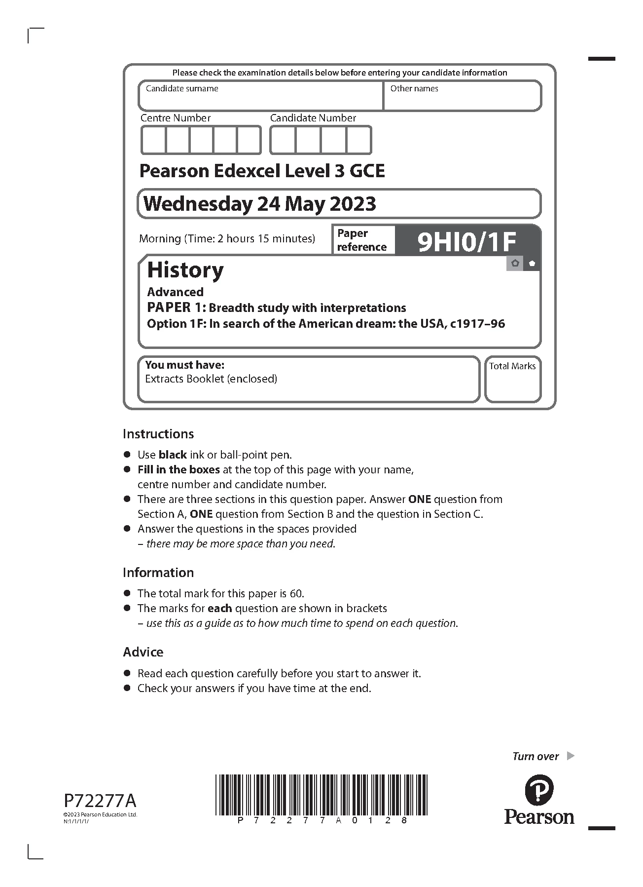 PEARSON EDEXCEL A LEVEL History PAPER 1 2023 QUESTION PAPER (9HI0/1F: In search of the American dream: the USA, c1917–96). PEARSON EDEXCEL A LEVEL History PAPER 1 2023 QUESTION PAPER (9HI0/1F: In search of the American dream: the USA, c1917–96) Pearson Edexcel A and AS Papers and Mark Schemes
