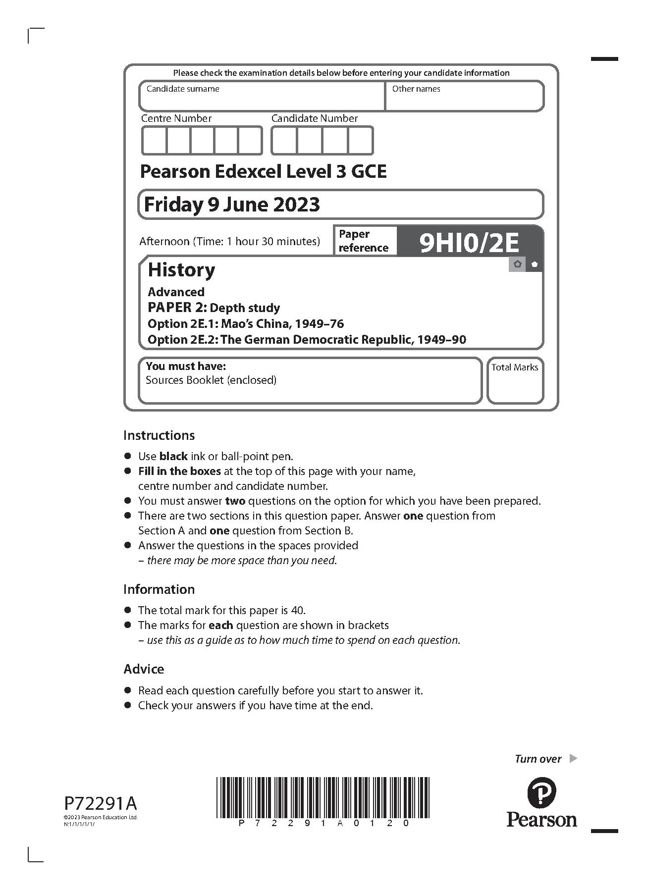 PEARSON EDEXCEL A LEVEL History PAPER 2 2023 QUESTION PAPER (9HI0/2E: Option 2E.1: Mao’s China, 1949–76 & Option 2E.2: The German Democratic Republic, 1949–90). PEARSON EDEXCEL A LEVEL History PAPER 2 2023 QUESTION PAPER (9HI0/2E: Option 2E.1: Mao’s China, 1949–76 & Option 2E.2: The German Democratic Republic, 1949–90) Pearson Edexcel A and AS Papers and Mark Schemes