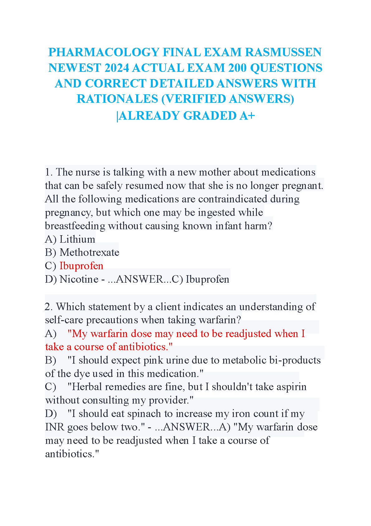 Rasmussen Pharmacology Final Exam 2024: 200 Questions & Verified Answers with Rationales by [Author Names]. Rasmussen Pharmacology Final Exam 2024: 200 Questions & Verified Answers with Rationales by [Author Names] Rasmussen Pharmacology