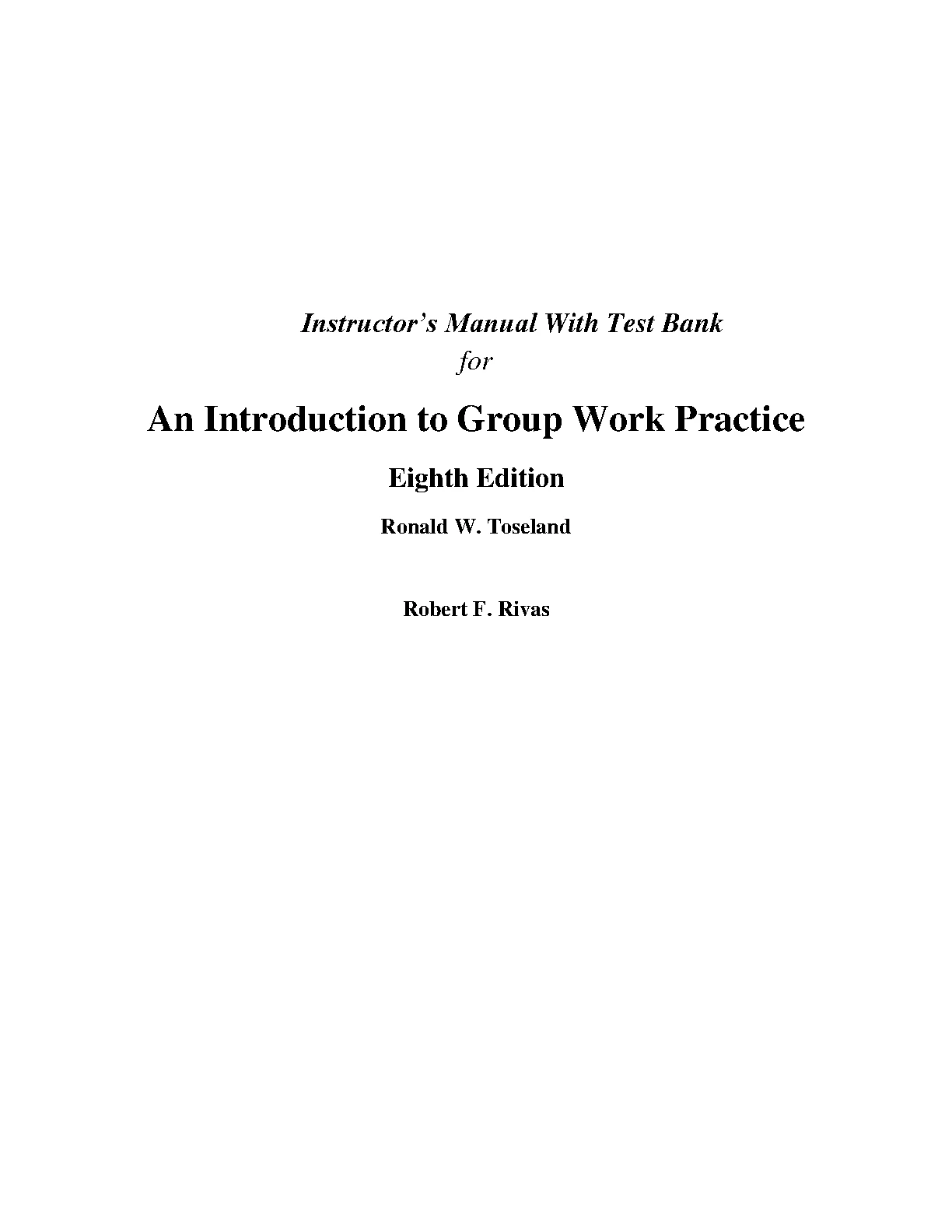 Test Bank for An Introduction to Group Work Practice 8th Edition by Ronald Toseland Robert Rivas. Test Bank for An Introduction to Group Work Practice 8th Edition by Ronald Toseland Robert Rivas SOLUTIONS MANUAL