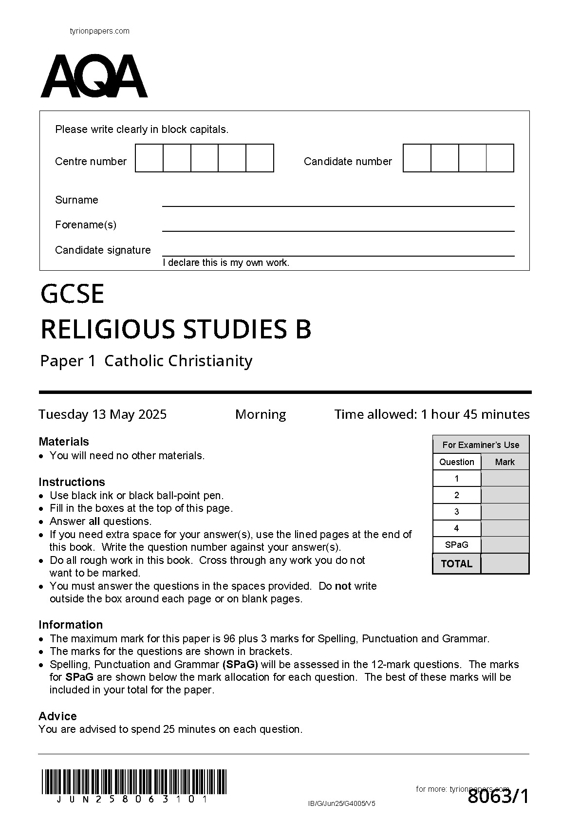 MERGED 2025 AQA GCSE RELIGIOUS STUDIES B Paper 1 Question Paper and Mark Scheme (8063/1: Catholic Christianity). MERGED 2025 AQA GCSE RELIGIOUS STUDIES B Paper 1 Question Paper and Mark Scheme (8063/1: Catholic Christianity) AQA GCSE QUESTION PAPERS AND MARK SCHEMES