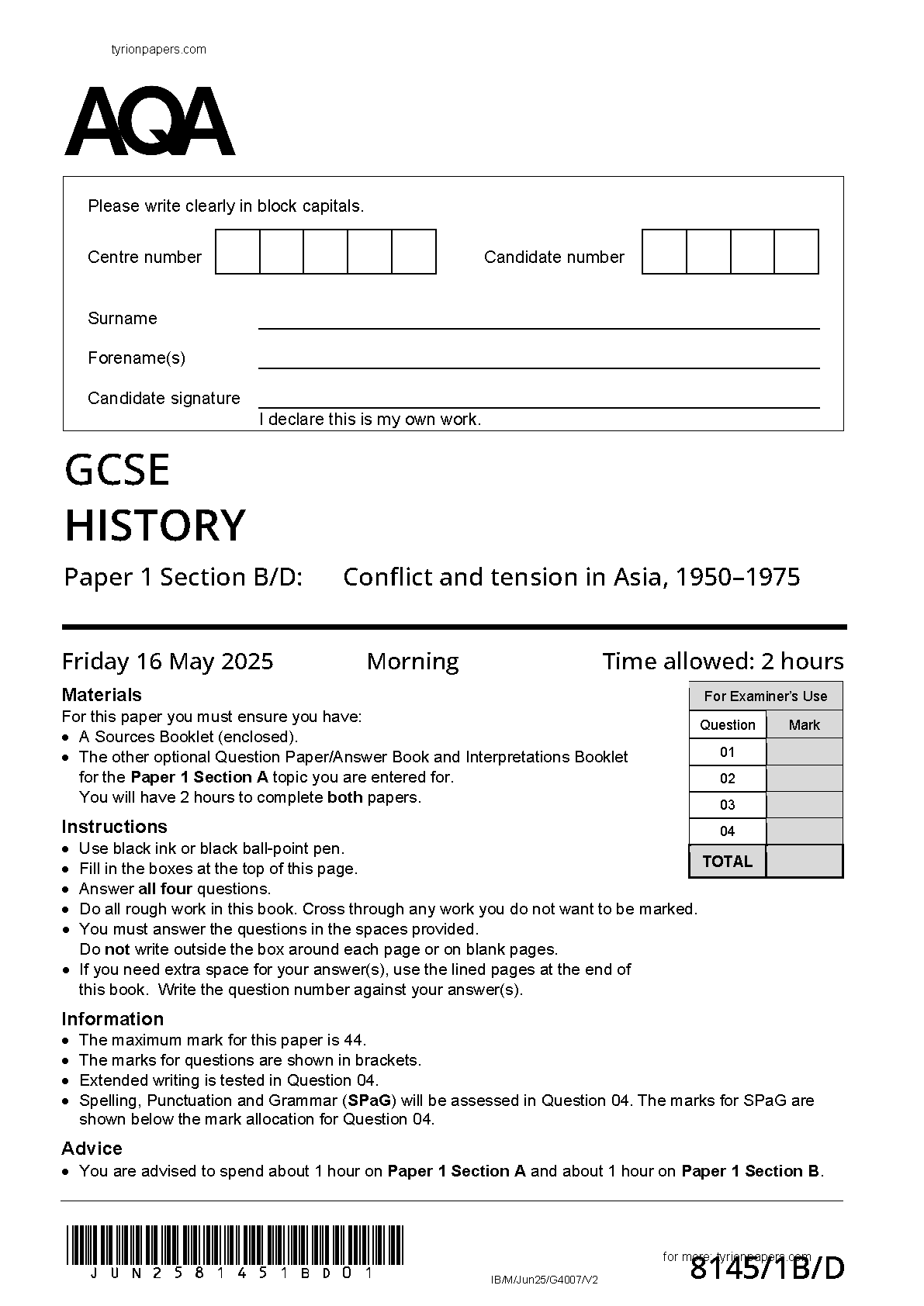 MERGED 2025 AQA GCSE HISTORY Paper 1 Section B/D Question Paper and Mark Scheme (8145/1B/D: Conflict and tension in Asia, 1950–1975). MERGED 2025 AQA GCSE HISTORY Paper 1 Section B/D Question Paper and Mark Scheme (8145/1B/D: Conflict and tension in Asia, 1950–1975) AQA GCSE QUESTION PAPERS AND MARK SCHEMES