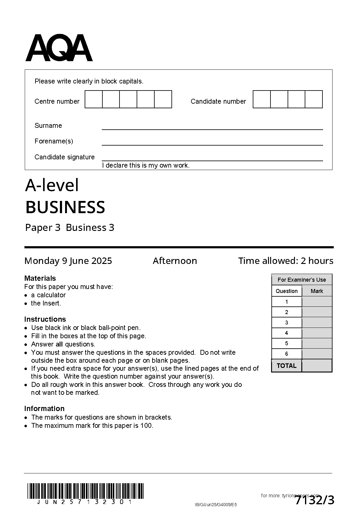 2025 AQA A Level BUSINESS Paper 3 and Mark Scheme Combined (7132/3: Business 3). 2025 AQA A Level BUSINESS Paper 3 and Mark Scheme Combined (7132/3: Business 3) AQA Papers & Mark Schemes