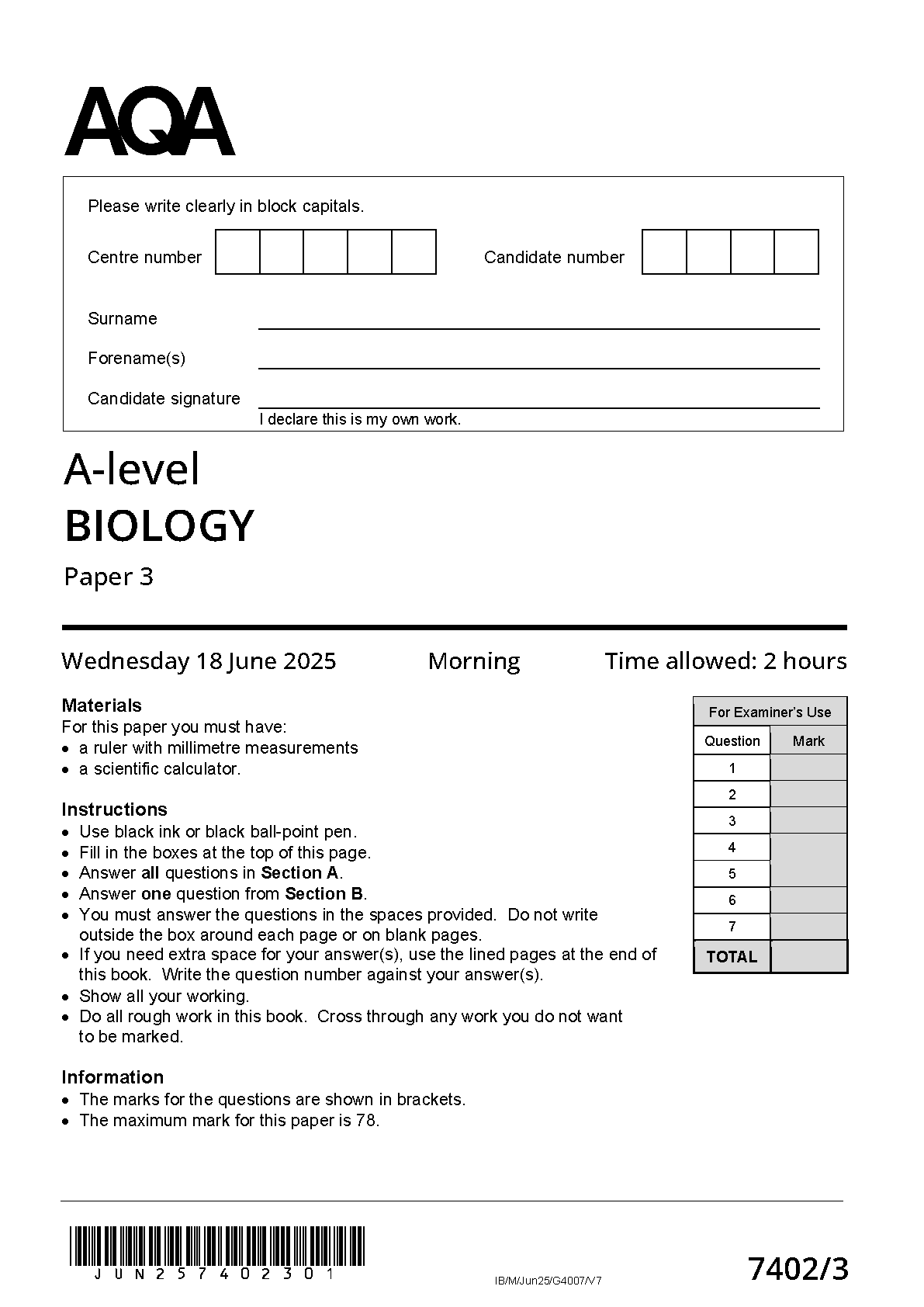 2025 AQA A level BIOLOGY Paper 3 and Mark Scheme Combined (7402/3). 2025 AQA A level BIOLOGY Paper 3 and Mark Scheme Combined (7402/3) AQA Papers & Mark Schemes