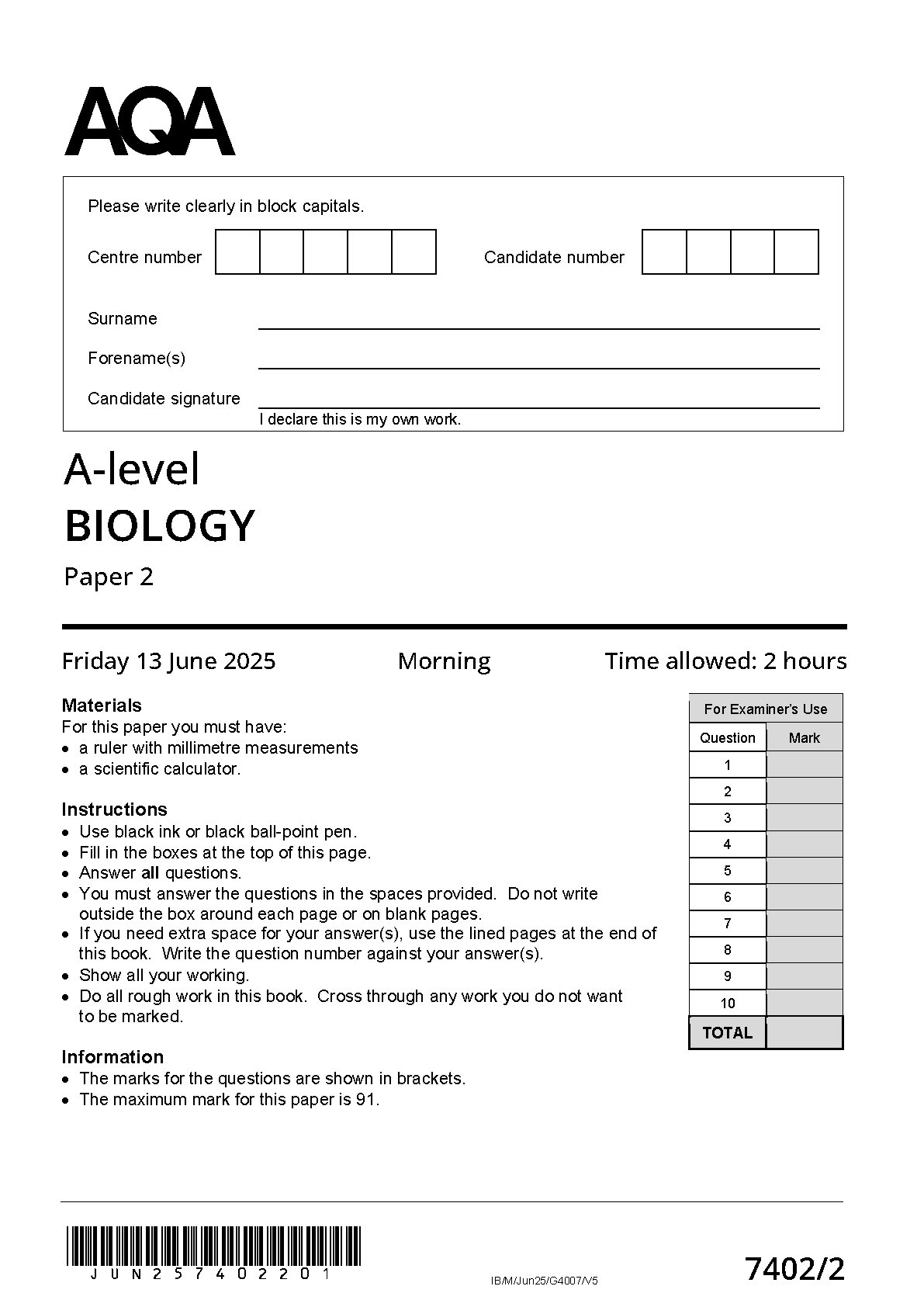 2025 AQA A level BIOLOGY Paper 2 Question Paper and Mark Scheme Combined (7402/2). 2025 AQA A level BIOLOGY Paper 2 Question Paper and Mark Scheme Combined (7402/2) AQA Papers & Mark Schemes