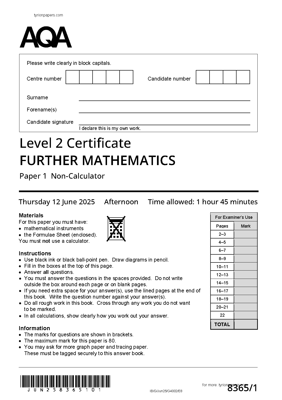 merged 2025 aqa gcse further mathematics paper 1 question paper and mark scheme (8365/1: non-calculator)