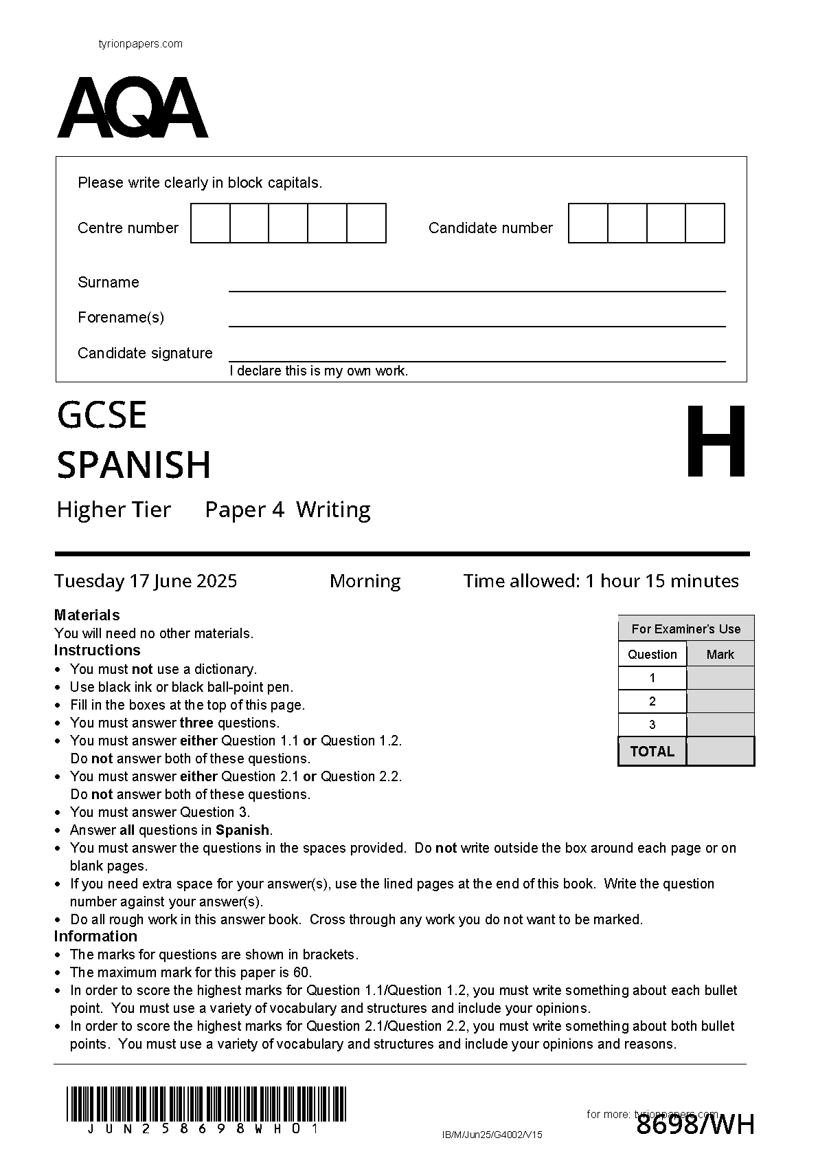 merged 2025 aqa gcse spanish paper 4 and mark scheme (8698/wh: writing higher tier)