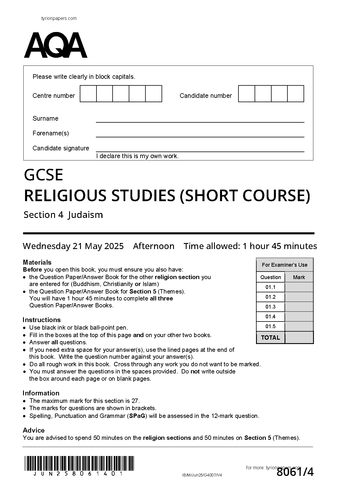 MERGED 2025 AQA GCSE RELIGIOUS STUDIES (SHORT COURSE) Section 4 and Mark Scheme (8061/4: Judaism). MERGED 2025 AQA GCSE RELIGIOUS STUDIES (SHORT COURSE) Section 4 and Mark Scheme (8061/4: Judaism) AQA GCSE QUESTION PAPERS AND MARK SCHEMES