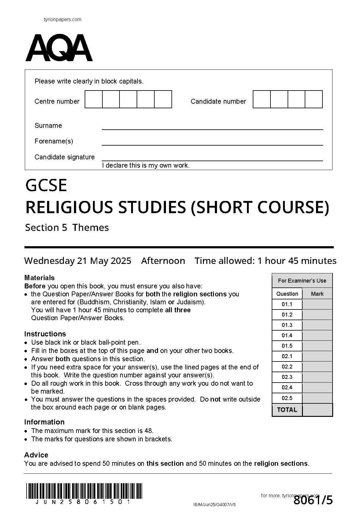 MERGED 2025 AQA GCSE RELIGIOUS STUDIES (SHORT COURSE) Section 5 and Mark Scheme (8061/5: Themes). MERGED 2025 AQA GCSE RELIGIOUS STUDIES (SHORT COURSE) Section 5 and Mark Scheme (8061/5: Themes) AQA GCSE QUESTION PAPERS AND MARK SCHEMES
