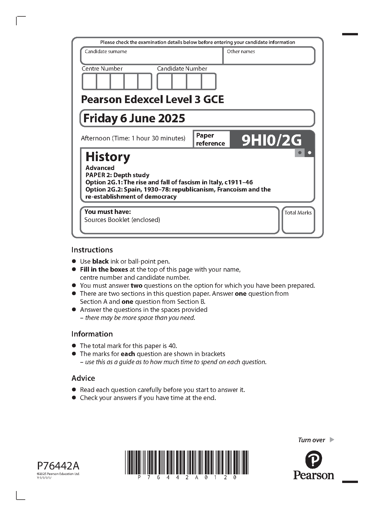 2025 Pearson Edexcel A Level History PAPER 2 and Mark Scheme Combined (9HI0/2G: Depth study). 2025 Pearson Edexcel A Level History PAPER 2 and Mark Scheme Combined (9HI0/2G: Depth study) Pearson Edexcel A and AS Papers and Mark Schemes