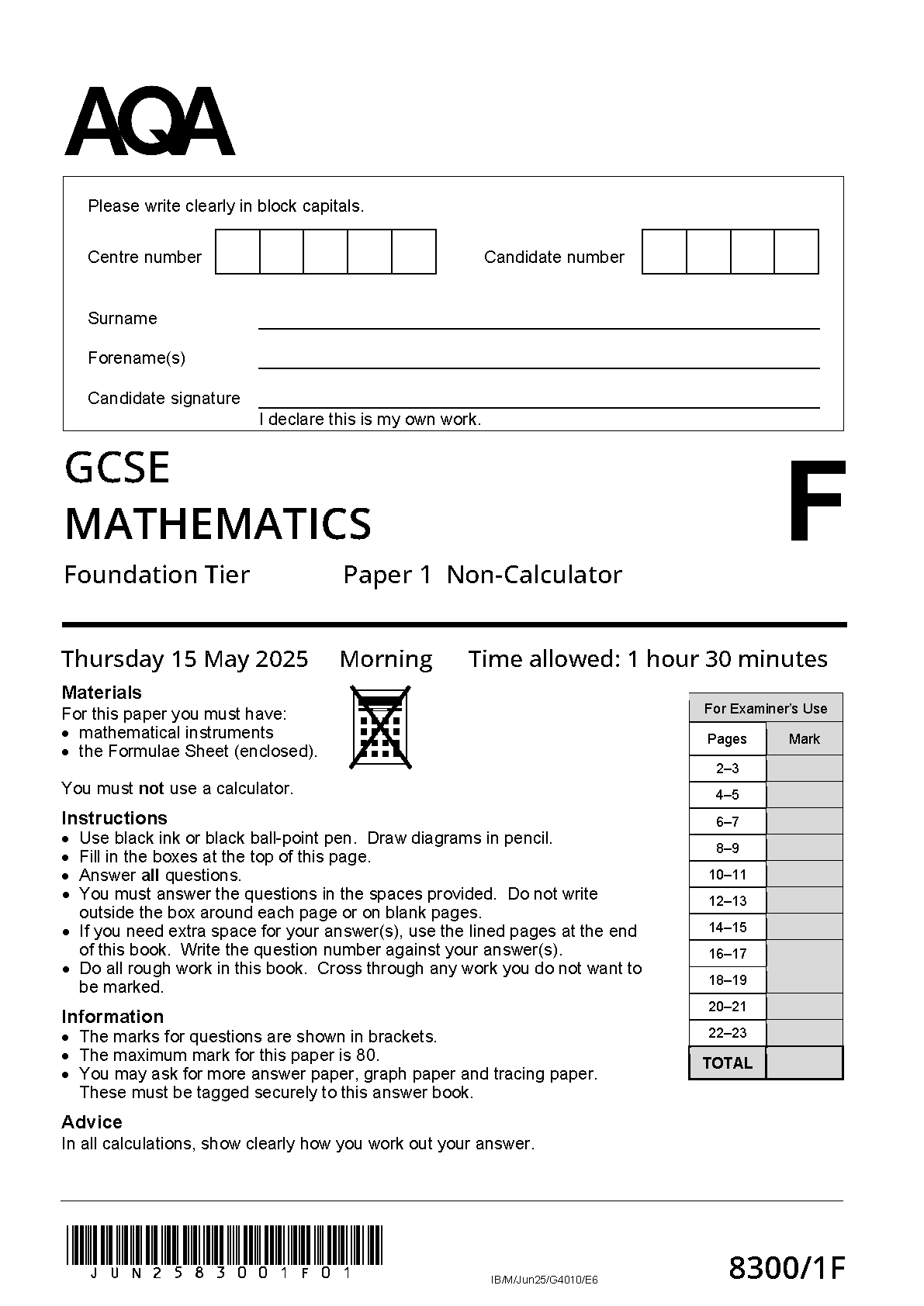 MERGED 2025 AQA GCSE MATHEMATICS Paper 1 and Mark Scheme (8300/1F: Non-Calculator Foundation Tier). MERGED 2025 AQA GCSE MATHEMATICS Paper 1 and Mark Scheme (8300/1F: Non-Calculator Foundation Tier) AQA GCSE QUESTION PAPERS AND MARK SCHEMES