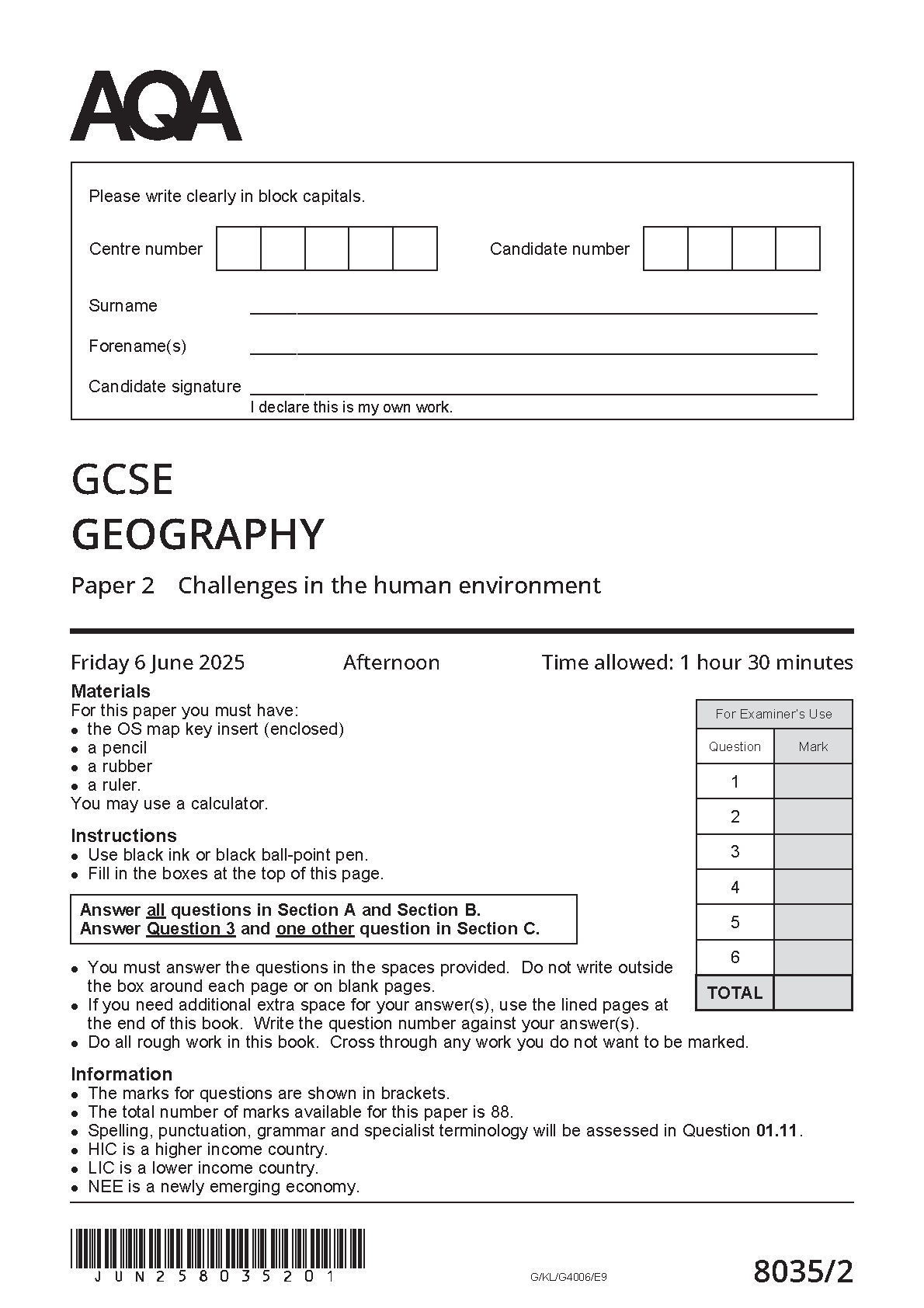 MERGED 2025 AQA GCSE Geography Paper 2 and Mark Scheme (8035/2: Challenges in the human environment). MERGED 2025 AQA GCSE Geography Paper 2 and Mark Scheme (8035/2: Challenges in the human environment) AQA GCSE QUESTION PAPERS AND MARK SCHEMES