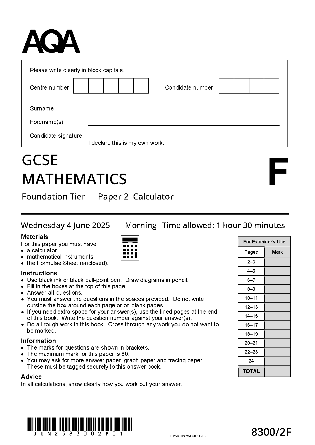 MERGED 2025 AQA GCSE MATHEMATICS Paper 2 and Mark Scheme (8300/2F: Calculator Foundation Tier). MERGED 2025 AQA GCSE MATHEMATICS Paper 2 and Mark Scheme (8300/2F: Calculator Foundation Tier) AQA GCSE QUESTION PAPERS AND MARK SCHEMES