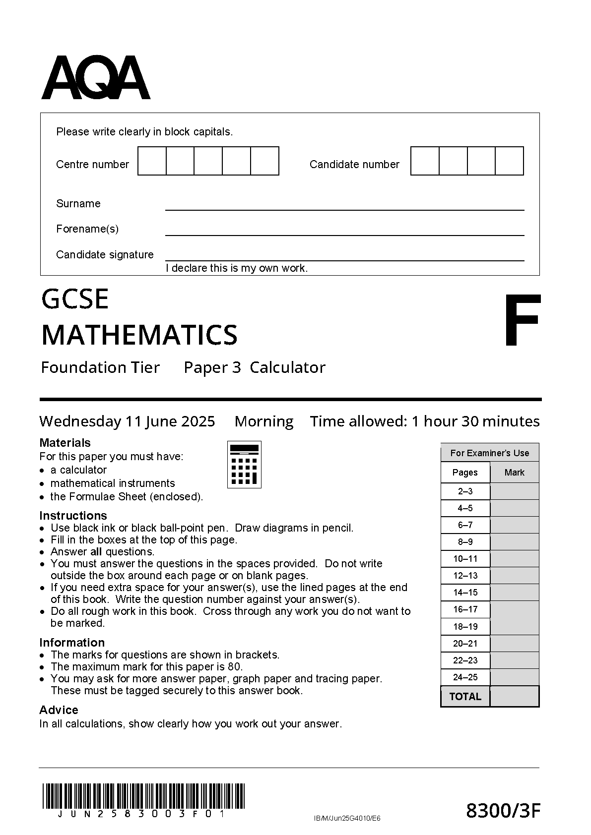 MERGED 2025 AQA GCSE MATHEMATICS Paper 3 and Mark Scheme (8300/3F: Calculator Foundation Tier). MERGED 2025 AQA GCSE MATHEMATICS Paper 3 and Mark Scheme (8300/3F: Calculator Foundation Tier) AQA GCSE QUESTION PAPERS AND MARK SCHEMES