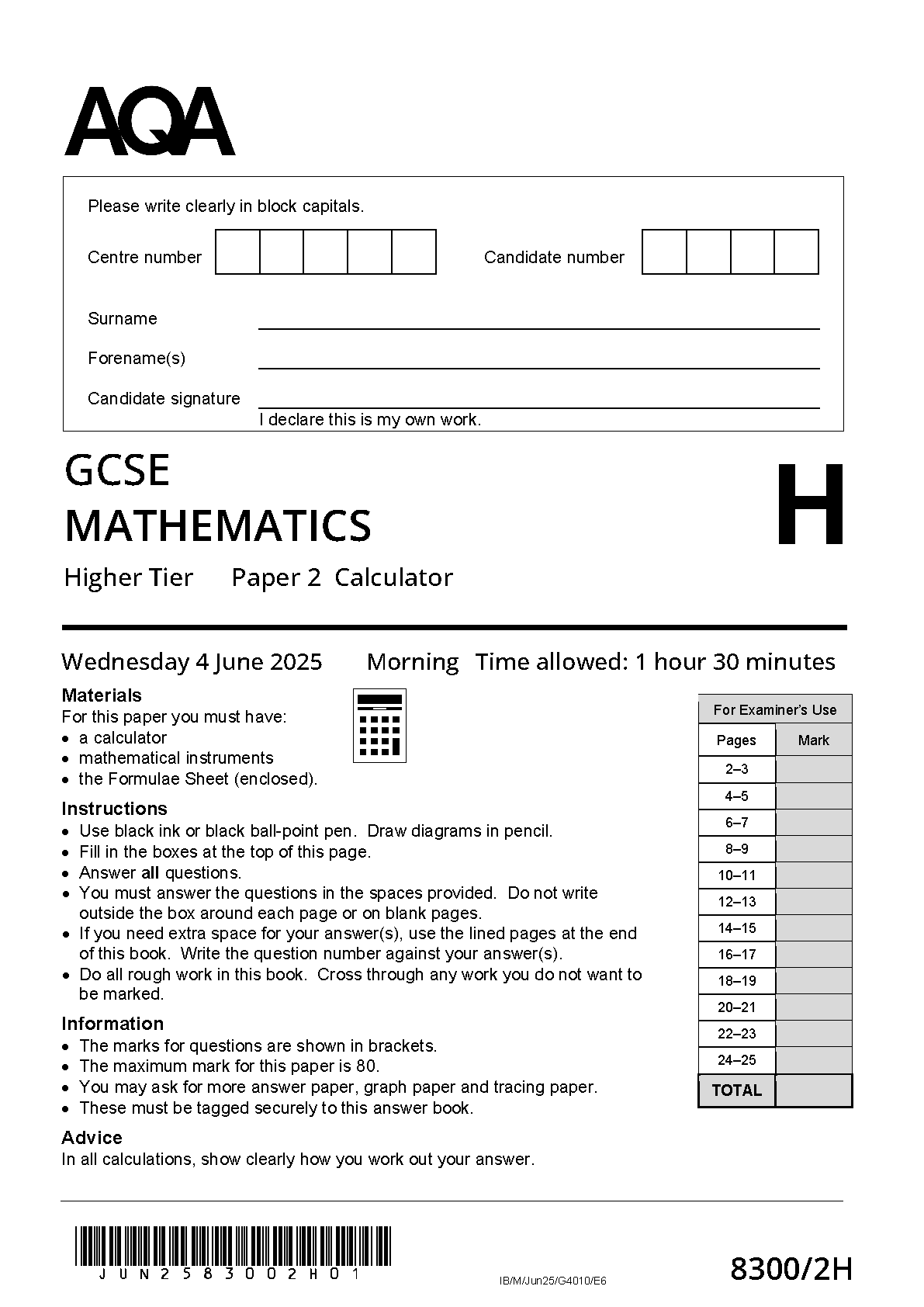 merged 2025 aqa gcse mathematics paper 2 and mark scheme (8300/2h: calculator higher tier)