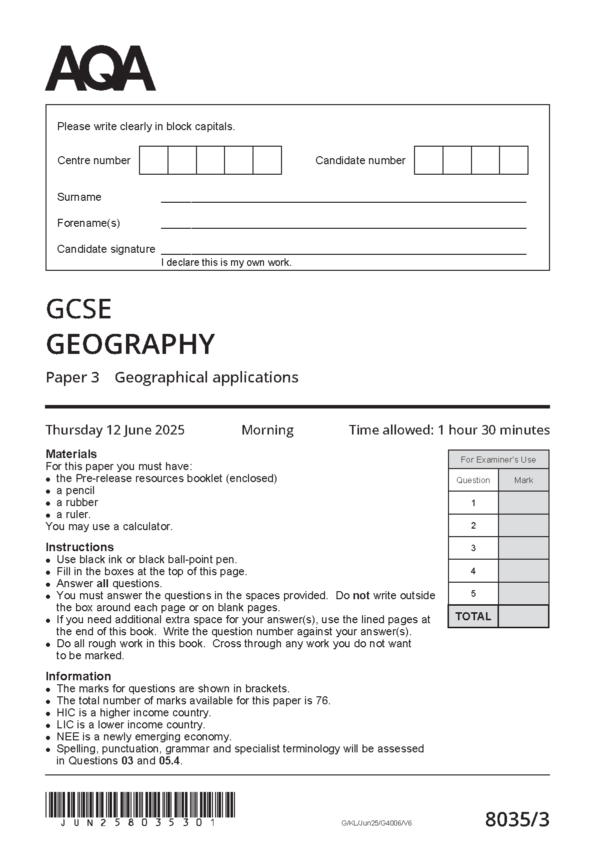 MERGED 2025 AQA GCSE Geography Paper 3 and Mark Scheme (8035/3: Geographical applications). MERGED 2025 AQA GCSE Geography Paper 3 and Mark Scheme (8035/3: Geographical applications) AQA GCSE QUESTION PAPERS AND MARK SCHEMES