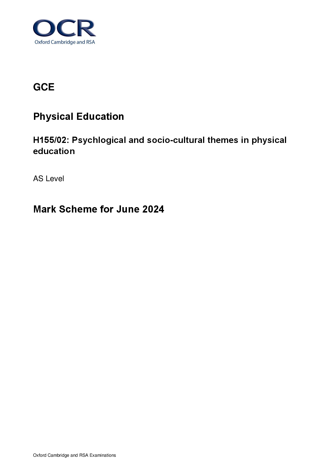 OCR GCE PHYSICAL EDUCATION AS LEVEL MARK SCHEME 2024(H155/02:PSYCHLOGICAL AND SOCIAL-CULTURAL THEMES IN PHYSICAL EDUCATION). OCR GCE PHYSICAL EDUCATION AS LEVEL MARK SCHEME 2024(H155/02:PSYCHLOGICAL AND SOCIAL-CULTURAL THEMES IN PHYSICAL EDUCATION) OCR GCE A & AS LEVEL Papers and Mark Schemes