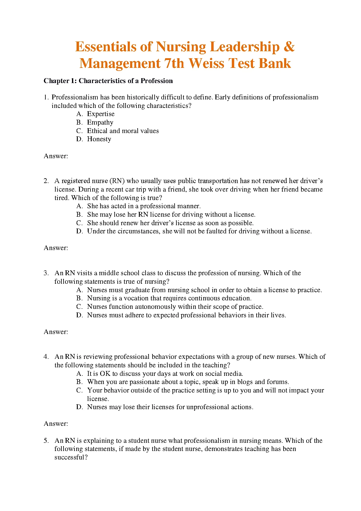 Test Bank For Essentials of Nursing Leadership & Management 7th Edition by Sally A. Weiss , Ruth M. Tappen and Karen Grimley. Test Bank For Essentials of Nursing Leadership & Management 7th Edition by Sally A. Weiss , Ruth M. Tappen and Karen Grimley TEST BANK