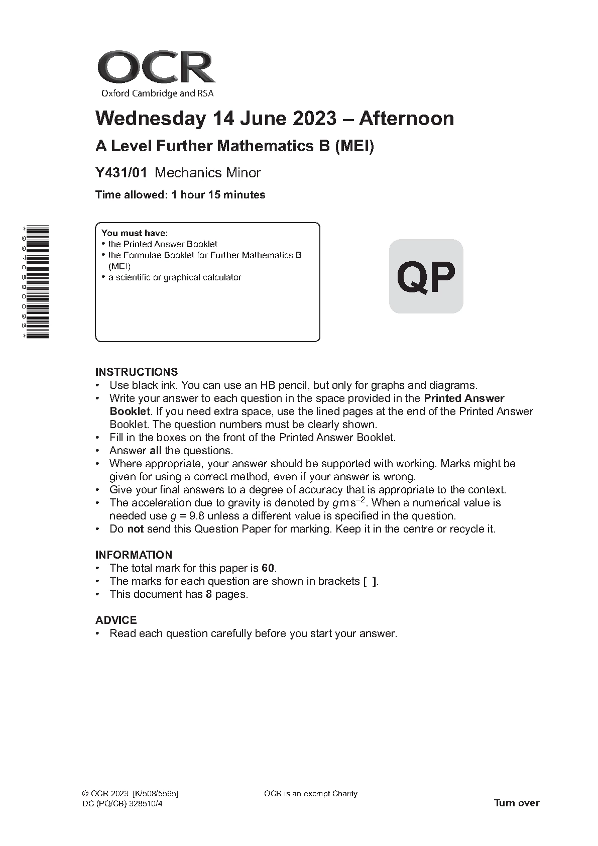 OCR GCE A LEVEL FURTHER MATHEMATICS B PAPER 1 QUESTION PAPER 2023 (Y431/01: Mechanics Minor). OCR GCE A LEVEL FURTHER MATHEMATICS B PAPER 1 QUESTION PAPER 2023 (Y431/01: Mechanics Minor) OCR GCE A & AS LEVEL Papers and Mark Schemes