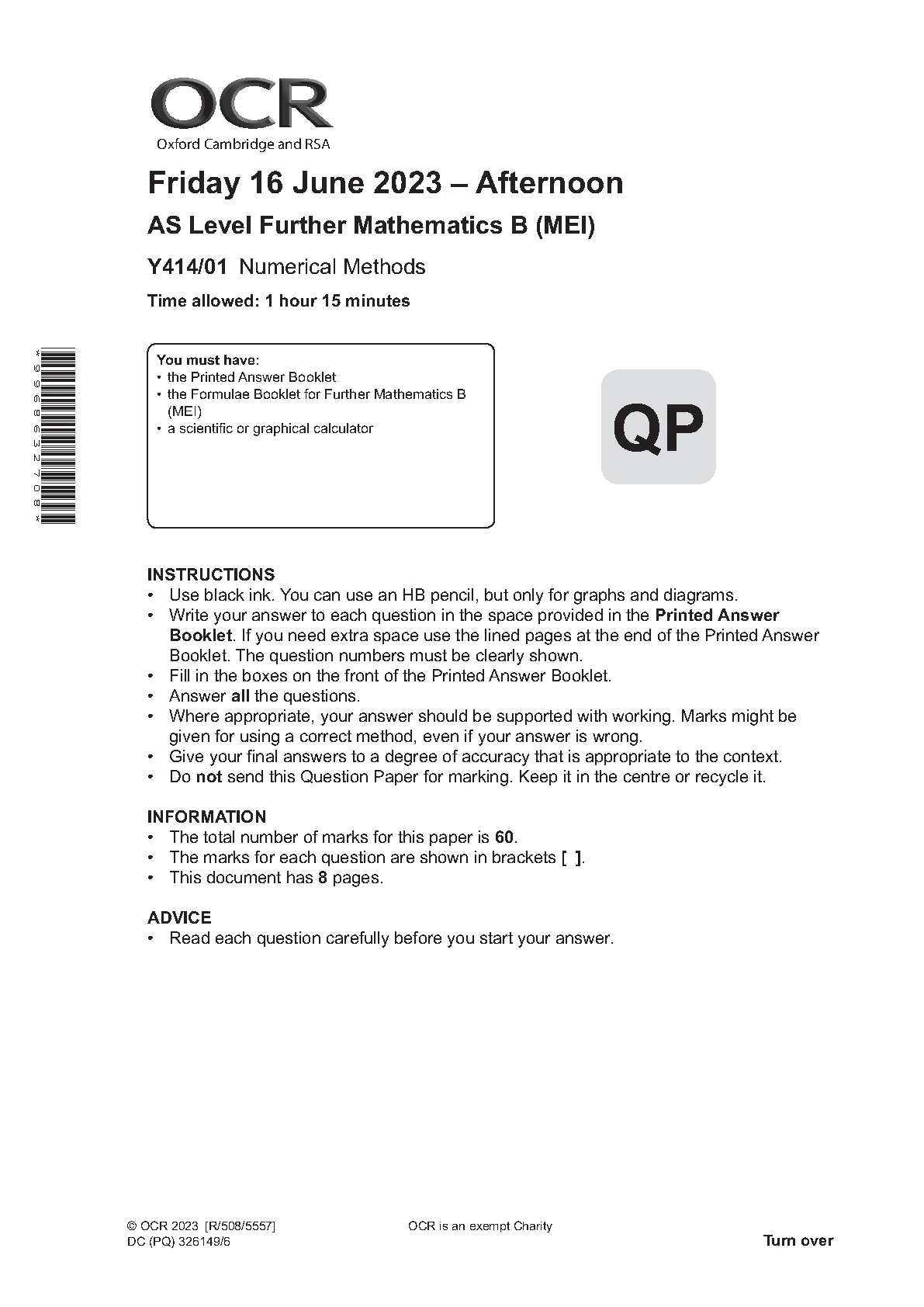 OCR GCE AS LEVEL FURTHER MATHEMATICS B PAPER 1 QUESTION PAPER 2023 (Y414/01: Numerical Methods). OCR GCE AS LEVEL FURTHER MATHEMATICS B PAPER 1 QUESTION PAPER 2023 (Y414/01: Numerical Methods) OCR GCE A & AS LEVEL Papers and Mark Schemes