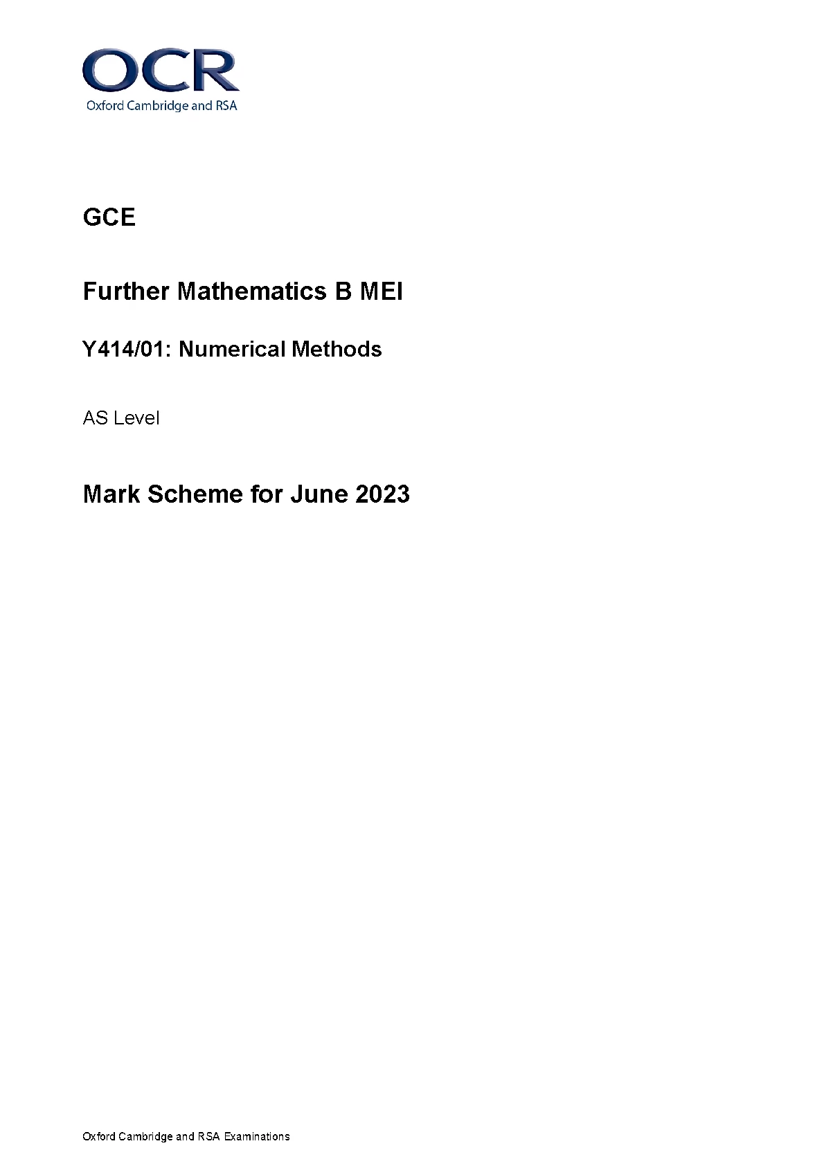 OCR GCE AS LEVEL FURTHER MATHEMATICS B PAPER 1 MARK SCHEME 2023 (Y414/01: Numerical Methods). OCR GCE AS LEVEL FURTHER MATHEMATICS B PAPER 1 MARK SCHEME 2023 (Y414/01: Numerical Methods) OCR GCE A & AS LEVEL Papers and Mark Schemes