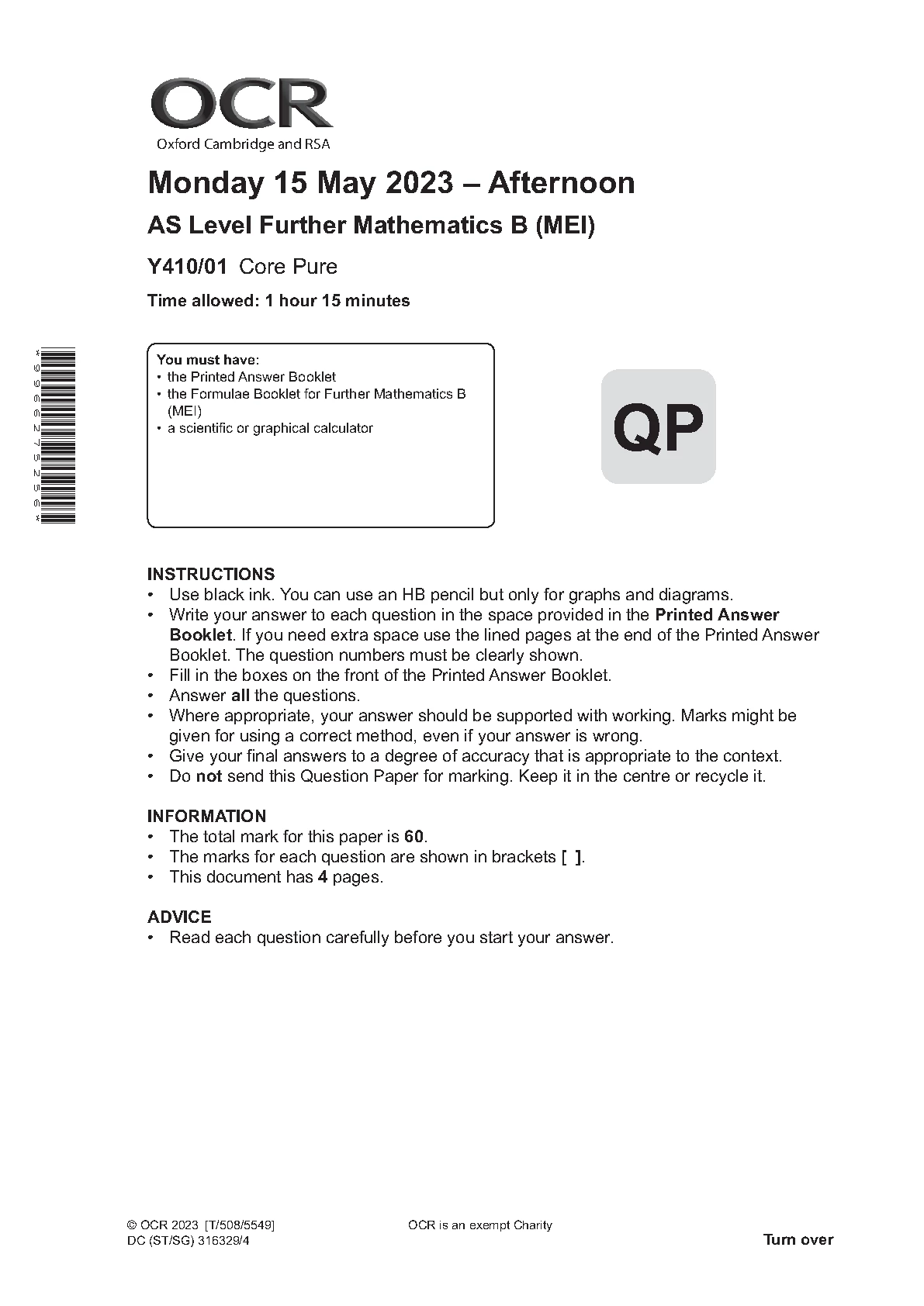 OCR GCE AS LEVEL FURTHER MATHEMATICS B PAPER 1 QUESTION PAPER 2023 (Y410/01: Core Pure). OCR GCE AS LEVEL FURTHER MATHEMATICS B PAPER 1 QUESTION PAPER 2023 (Y410/01: Core Pure) OCR GCE A & AS LEVEL Papers and Mark Schemes