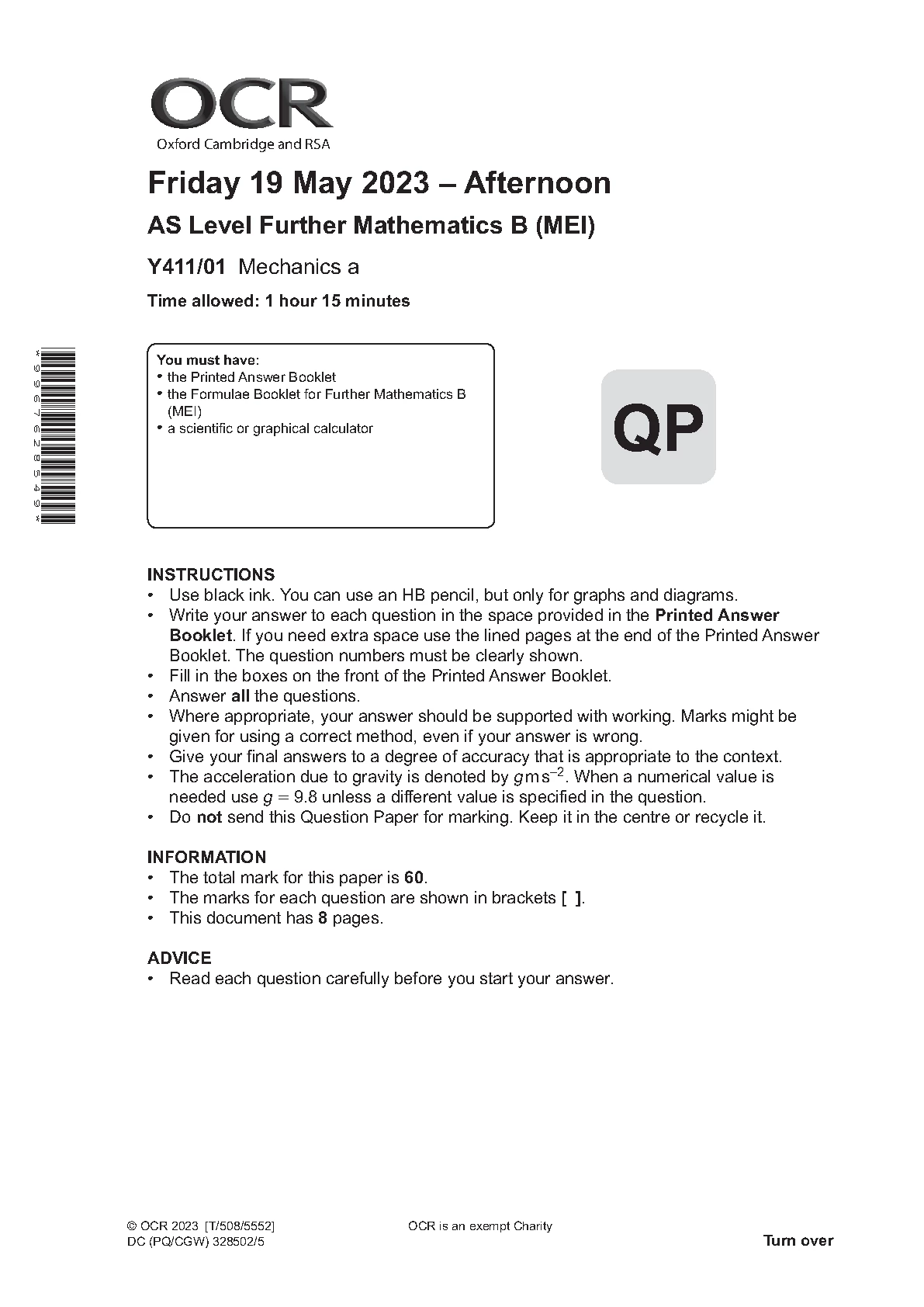 OCR GCE AS LEVEL FURTHER MATHEMATICS B PAPER 1 QUESTION PAPER 2023 (Y411/01: Mechanics A). OCR GCE AS LEVEL FURTHER MATHEMATICS B PAPER 1 QUESTION PAPER 2023 (Y411/01: Mechanics A) OCR GCE A & AS LEVEL Papers and Mark Schemes