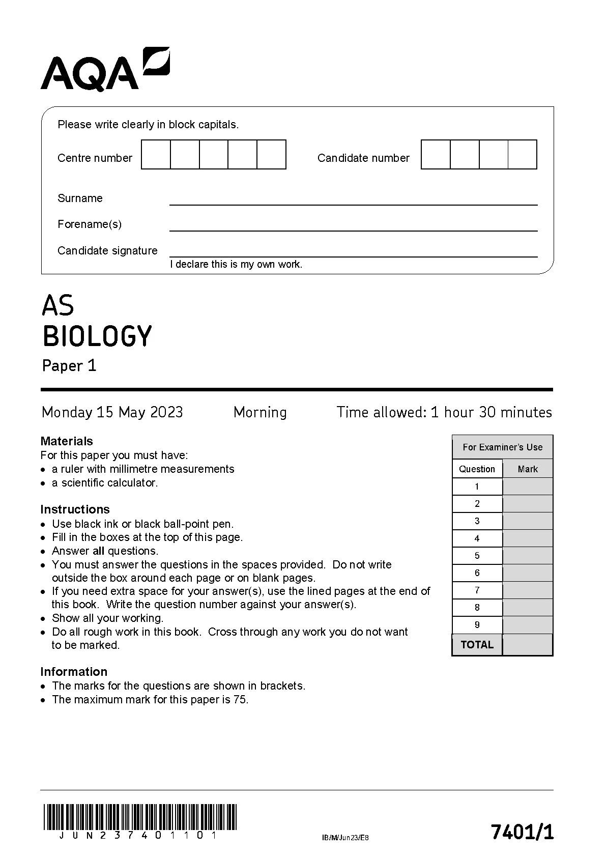 AQA AS BIOLOGY QUESTION PAPER 1 2023 (7401-1). AQA AS BIOLOGY QUESTION PAPER 1 2023 (7401-1) AQA Questions and Marking Scheme
