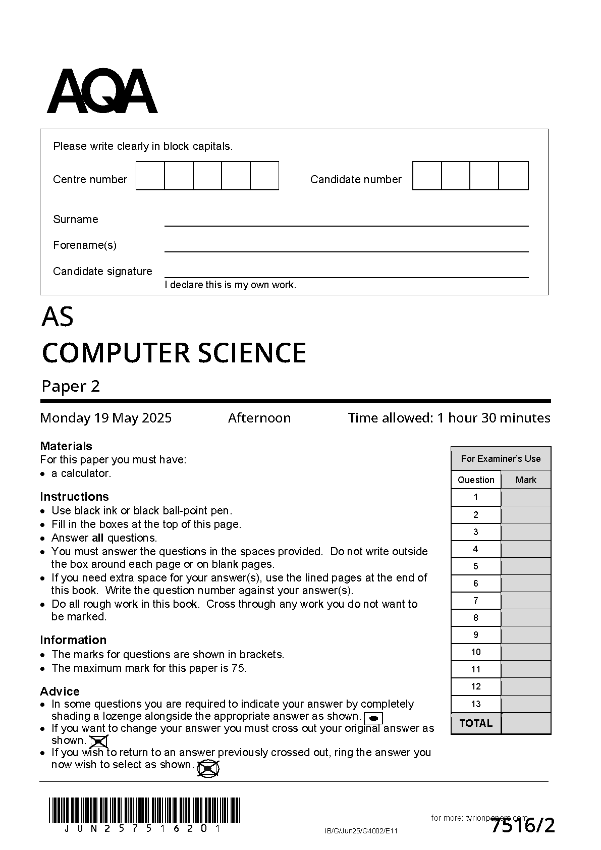 2025 AQA AS Level COMPUTER SCIENCE Paper 1 and Mark Scheme Combined (7516/1). 2025 AQA AS Level COMPUTER SCIENCE Paper 1 and Mark Scheme Combined (7516/1) AQA Papers & Mark Schemes
