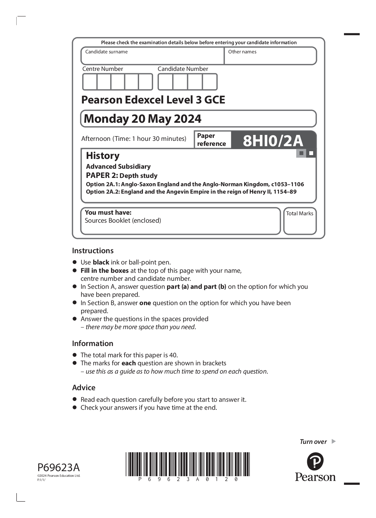PEARSON EDEXCEL GCE AS LEVEL HISTORY PAPER 2 QUESTION PAPER 2024 ( 8HI0/2A). PEARSON EDEXCEL GCE AS LEVEL HISTORY PAPER 2 QUESTION PAPER 2024 ( 8HI0/2A) Pearson Edexcel A and AS Papers and Mark Schemes