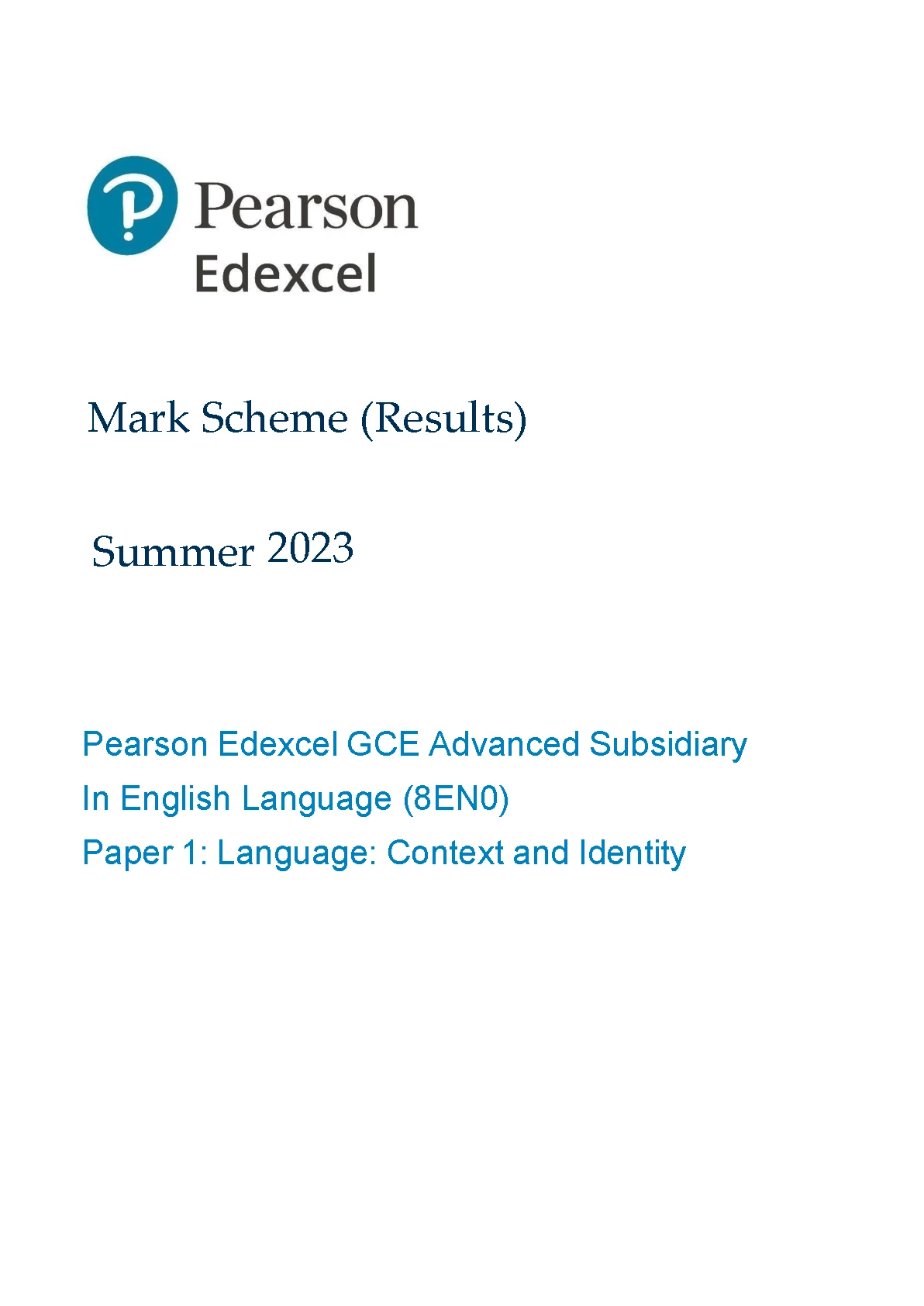 PEARSON EDEXCEL AS LEVEL English Language PAPER 1 2023 MARK SCHEME (8EN0/01: Language: Context and Identity). PEARSON EDEXCEL AS LEVEL English Language PAPER 1 2023 MARK SCHEME (8EN0/01: Language: Context and Identity) Pearson Edexcel A and AS Papers and Mark Schemes