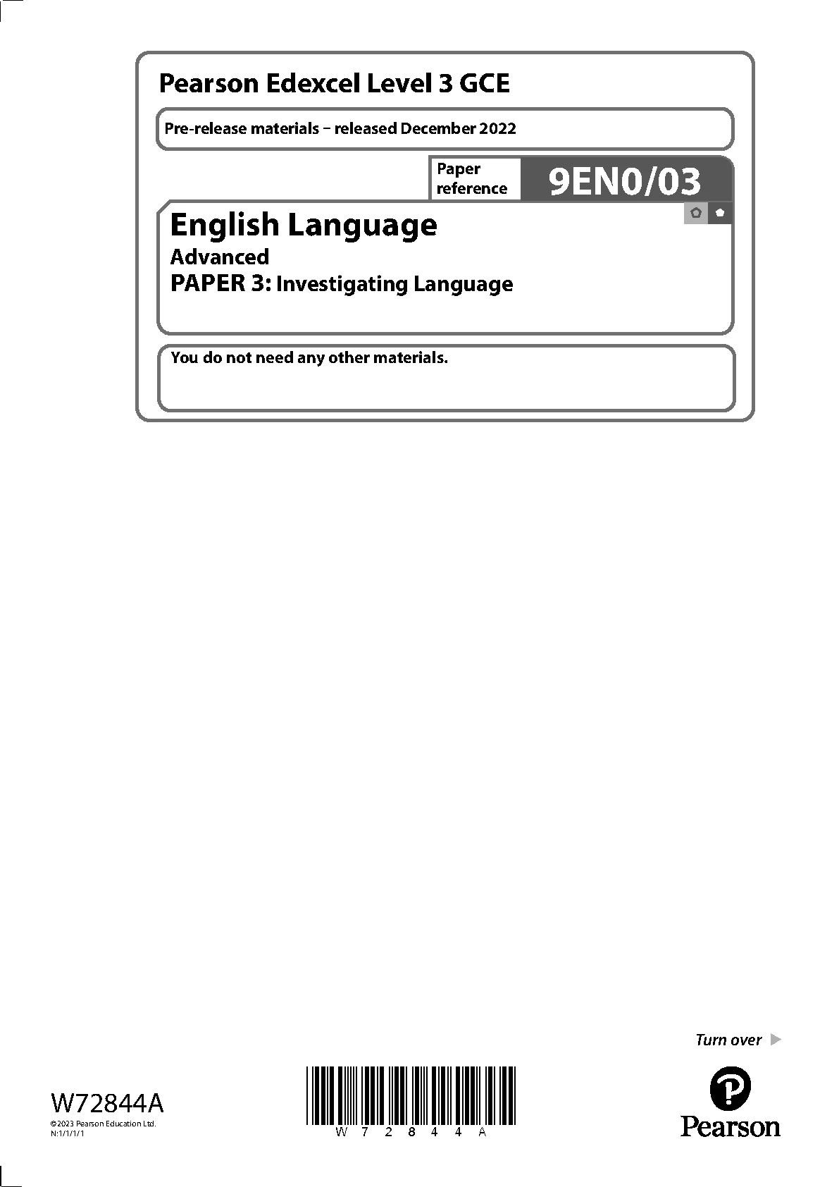PEARSON EDEXCEL A LEVEL English Language PAPER 3 2023 QUESTION PAPER (9EN0/03: Investigating Language - Pre-release materials). PEARSON EDEXCEL A LEVEL English Language PAPER 3 2023 QUESTION PAPER (9EN0/03: Investigating Language - Pre-release materials) Pearson Edexcel A and AS Papers and Mark Schemes