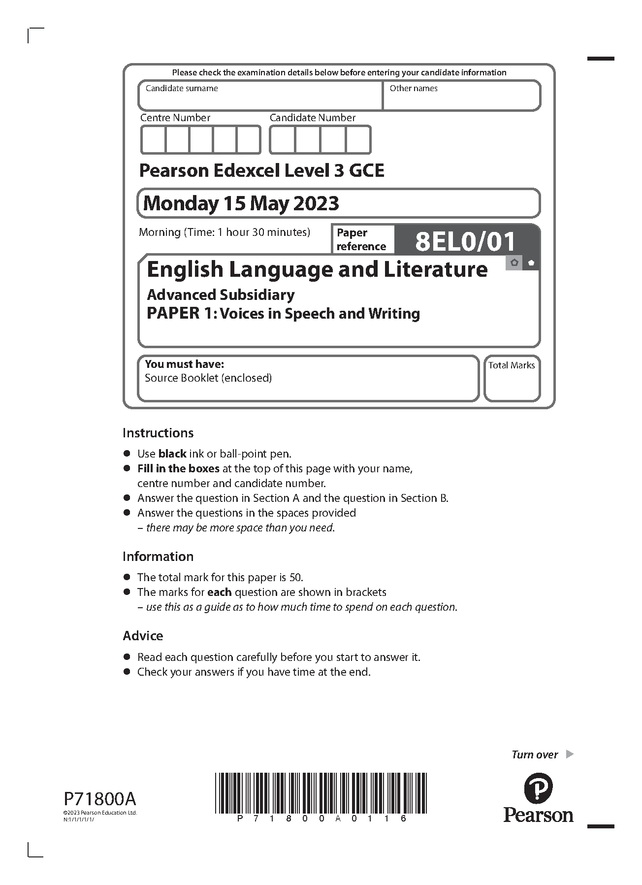 PEARSON EDEXCEL AS LEVEL English Language and Literature PAPER 1 2023 QUESTION PAPER (8EL0/01: Voices in Speech and Writing). PEARSON EDEXCEL AS LEVEL English Language and Literature PAPER 1 2023 QUESTION PAPER (8EL0/01: Voices in Speech and Writing) Pearson Edexcel A and AS Papers and Mark Schemes