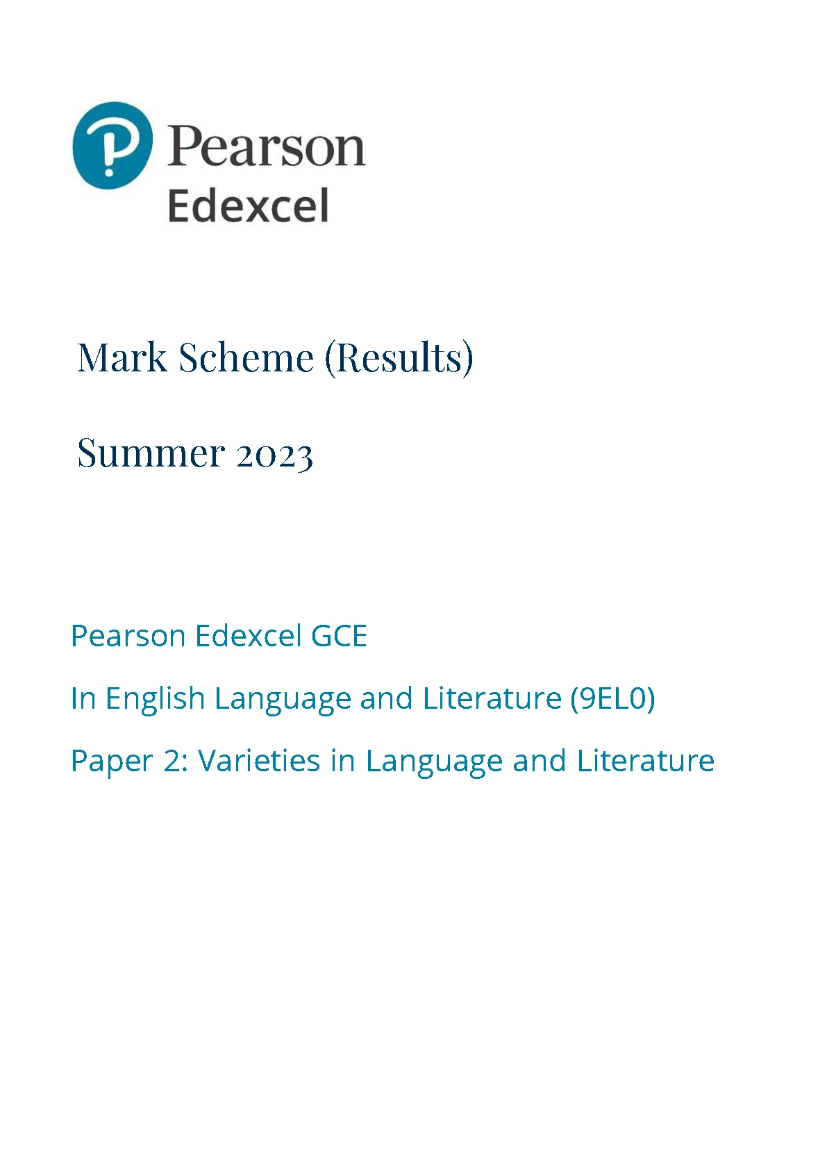 PEARSON EDEXCEL A LEVEL English Language and Literature PAPER 2 2023 MARK SCHEME (9EL0/02: Varieties in Language and Literature). PEARSON EDEXCEL A LEVEL English Language and Literature PAPER 2 2023 MARK SCHEME (9EL0/02: Varieties in Language and Literature) Pearson Edexcel A and AS Papers and Mark Schemes