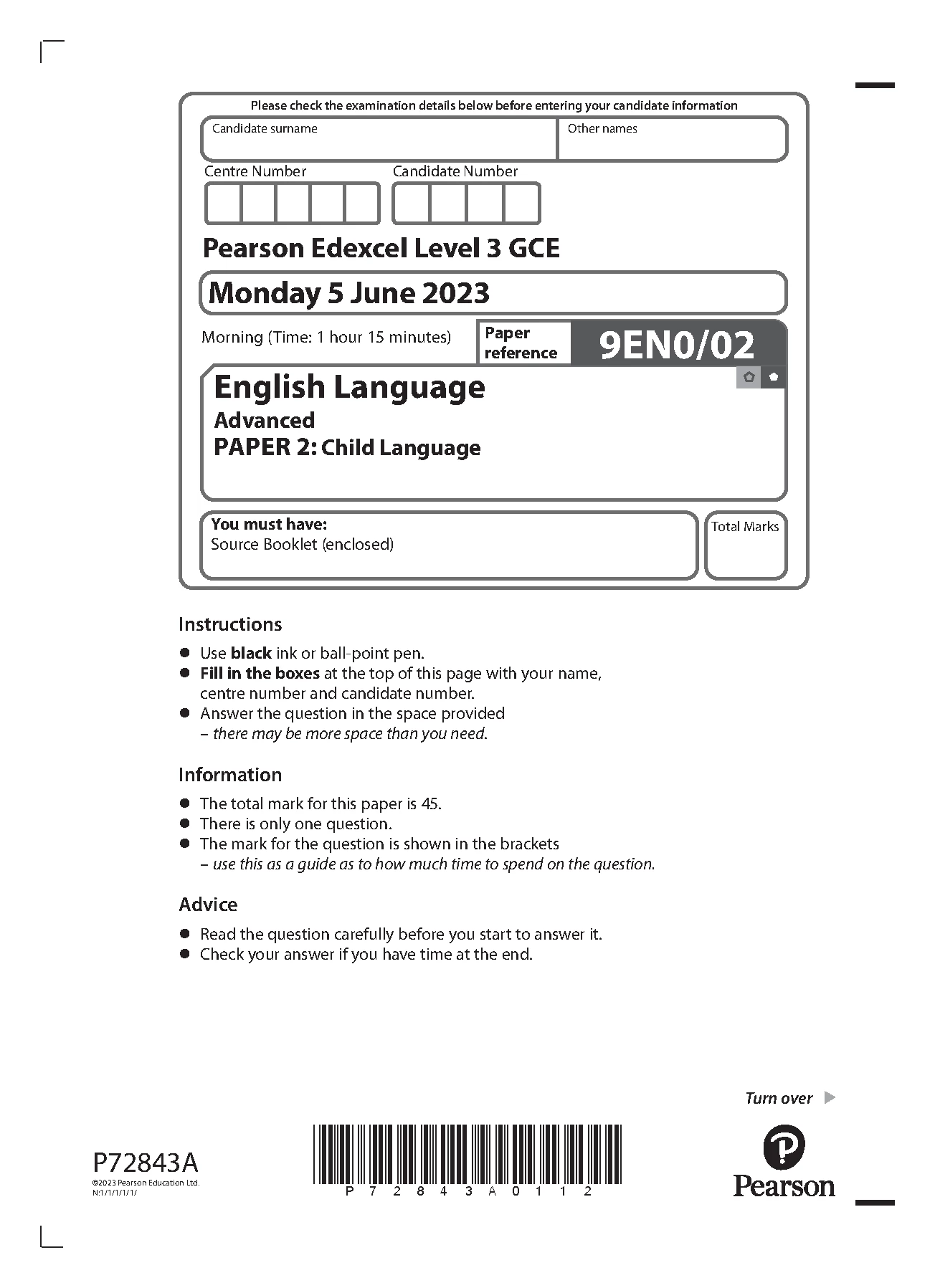 PEARSON EDEXCEL A LEVEL English Language PAPER 2 2023 QUESTION PAPER (9EN0/02: Child Language). PEARSON EDEXCEL A LEVEL English Language PAPER 2 2023 QUESTION PAPER (9EN0/02: Child Language) Pearson Edexcel A and AS Papers and Mark Schemes