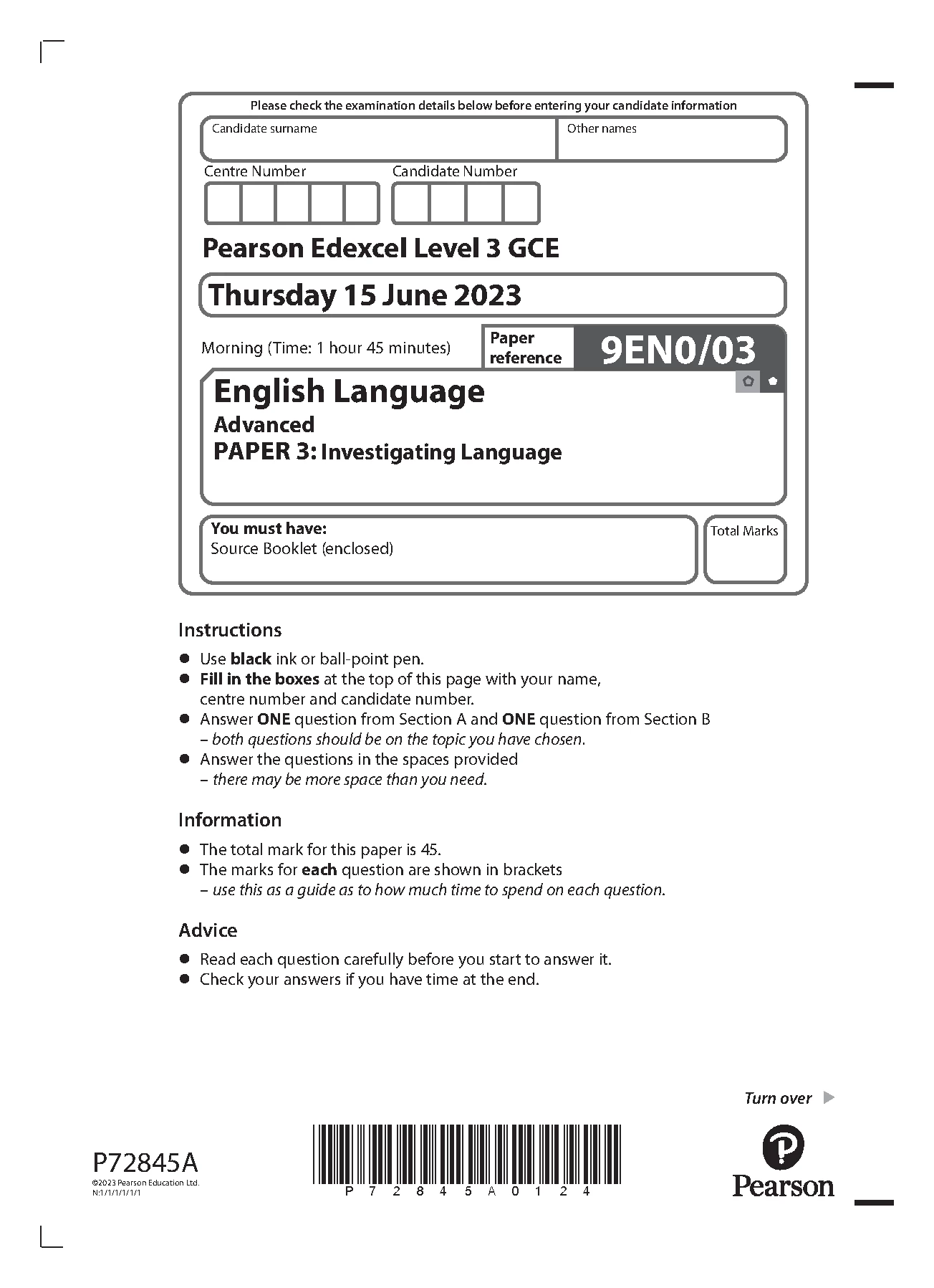 PEARSON EDEXCEL A LEVEL English Language PAPER 3 2023 QUESTION PAPER (9EN0/03: Investigating Language). PEARSON EDEXCEL A LEVEL English Language PAPER 3 2023 QUESTION PAPER (9EN0/03: Investigating Language) Pearson Edexcel A and AS Papers and Mark Schemes