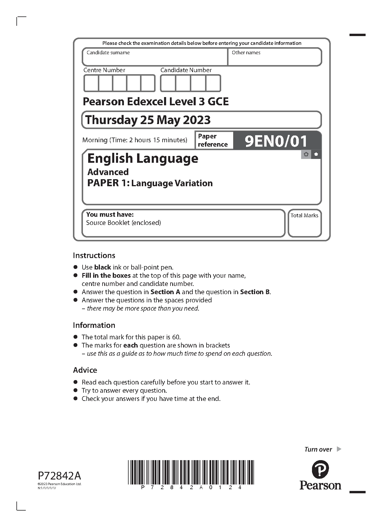 PEARSON EDEXCEL A LEVEL English Language PAPER 1 2023 QUESTION PAPER (9EN0/01: Language Variation). PEARSON EDEXCEL A LEVEL English Language PAPER 1 2023 QUESTION PAPER (9EN0/01: Language Variation) Pearson Edexcel A and AS Papers and Mark Schemes