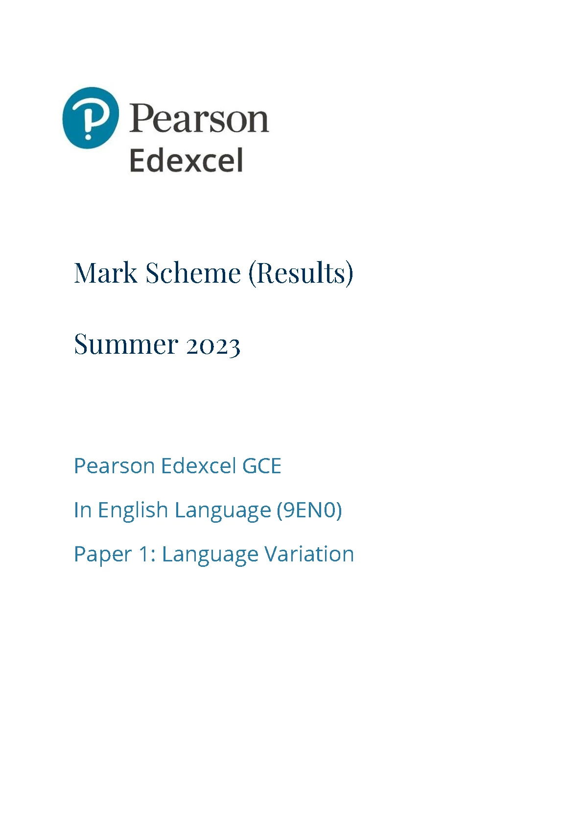 PEARSON EDEXCEL A LEVEL English Language PAPER 1 2023 MARK SCHEME (9EN0/01: Language Variation). PEARSON EDEXCEL A LEVEL English Language PAPER 1 2023 MARK SCHEME (9EN0/01: Language Variation) Pearson Edexcel A and AS Papers and Mark Schemes