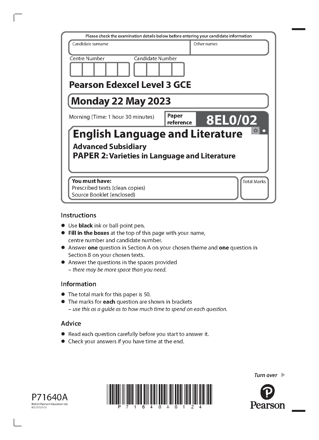 PEARSON EDEXCEL AS LEVEL English Language and Literature PAPER 2 2023 QUESTION PAPER (8EL0/02: Varieties in Language and Literature). PEARSON EDEXCEL AS LEVEL English Language and Literature PAPER 2 2023 QUESTION PAPER (8EL0/02: Varieties in Language and Literature) Pearson Edexcel A and AS Papers and Mark Schemes
