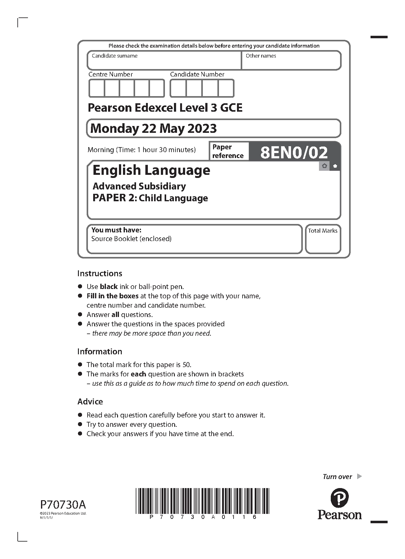 PEARSON EDEXCEL AS LEVEL English Language PAPER 2 2023 QUESTION PAPER (8EN0/02: Child Language). PEARSON EDEXCEL AS LEVEL English Language PAPER 2 2023 QUESTION PAPER (8EN0/02: Child Language) Pearson Edexcel A and AS Papers and Mark Schemes