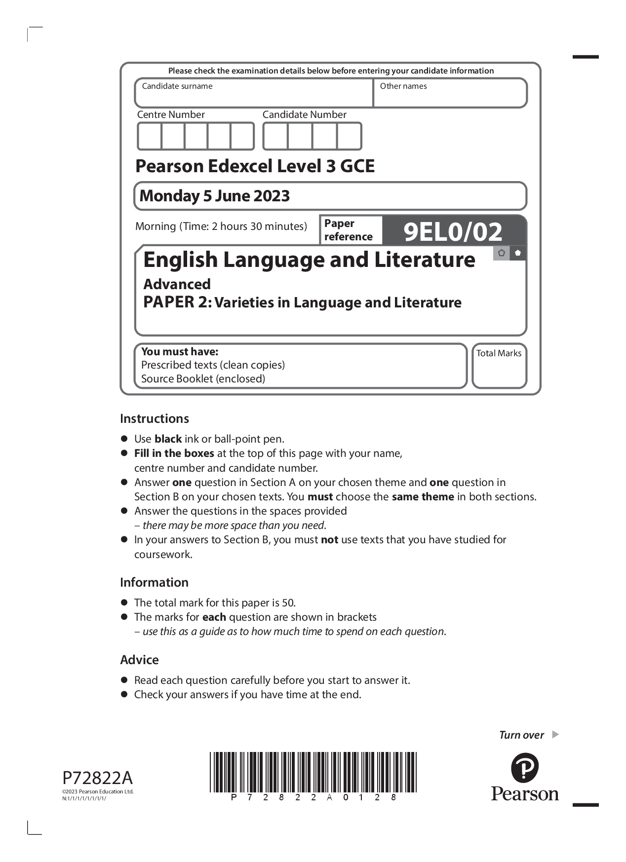 PEARSON EDEXCEL A LEVEL English Language and Literature PAPER 2 2023 QUESTION PAPER (9EL0/02: Varieties in Language and Literature). PEARSON EDEXCEL A LEVEL English Language and Literature PAPER 2 2023 QUESTION PAPER (9EL0/02: Varieties in Language and Literature) Pearson Edexcel A and AS Papers and Mark Schemes