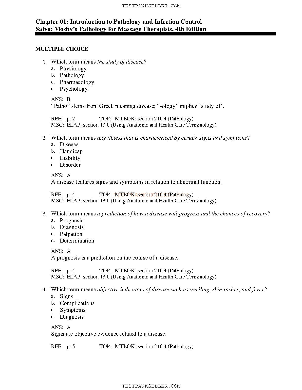 Test Bank for Mosby's Pathology for Massage Professionals 4th Edition by Susan G. Salvo. Test Bank for Mosby's Pathology for Massage Professionals 4th Edition by Susan G. Salvo TEST BANK
