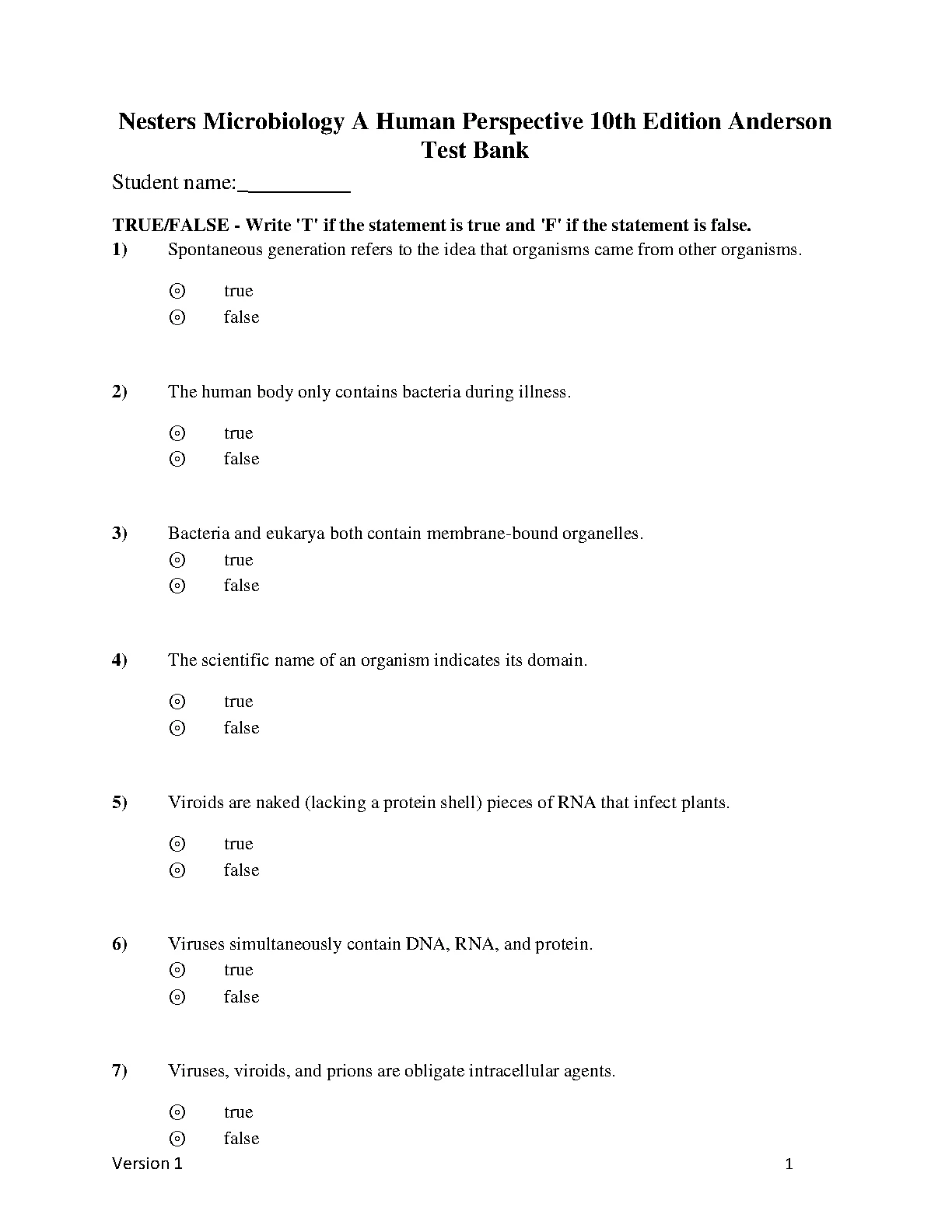 Test Bank For Nesters Microbiology A Human Perspective 10th Edition by Denise Anderson, Sarah Salm, Mira Beins, Eugene Nester. Test Bank For Nesters Microbiology A Human Perspective 10th Edition by Denise Anderson, Sarah Salm, Mira Beins, Eugene Nester TEST BANK