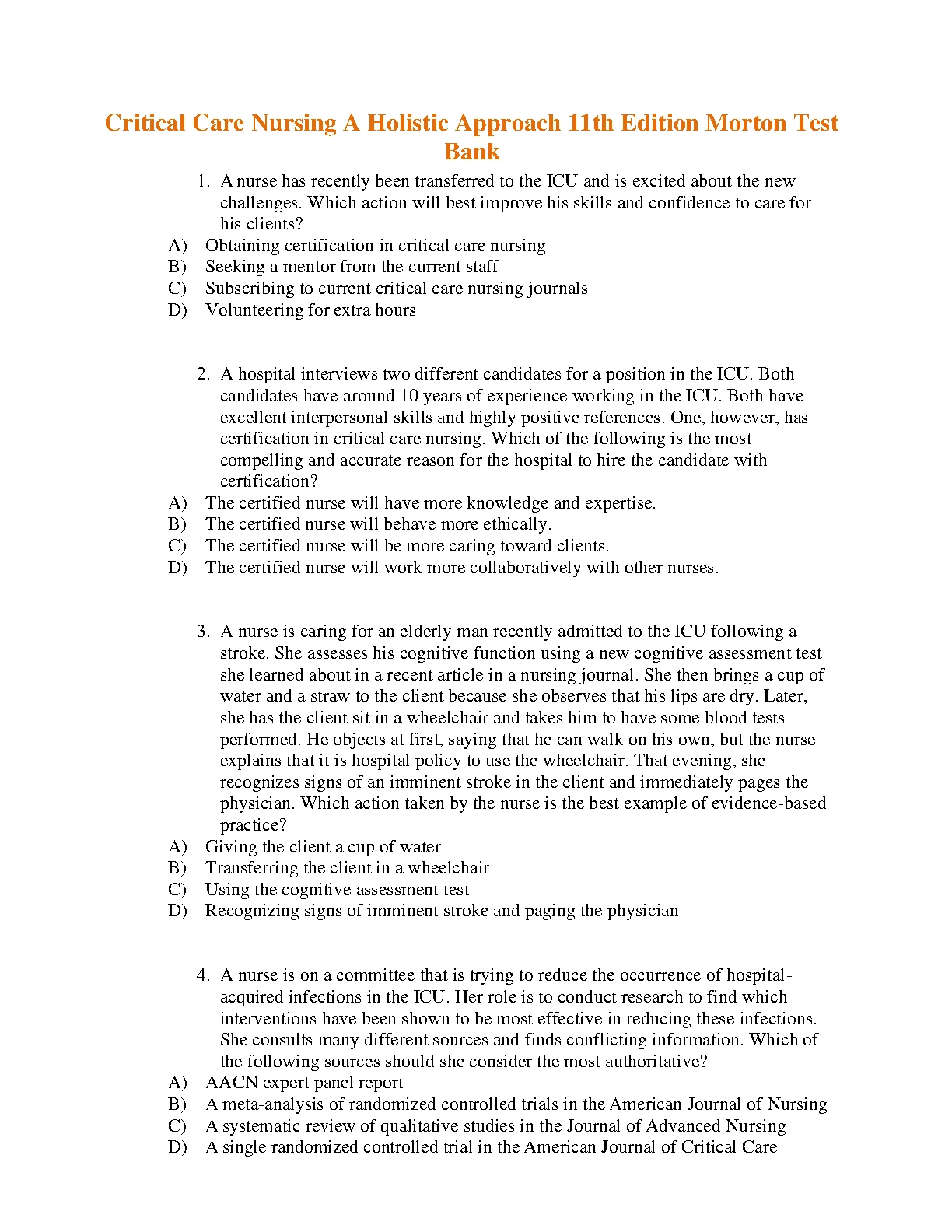 test bank for critical care nursing: a holistic approach 11th edition by patricia gonce morton and dorrie k. fontaine