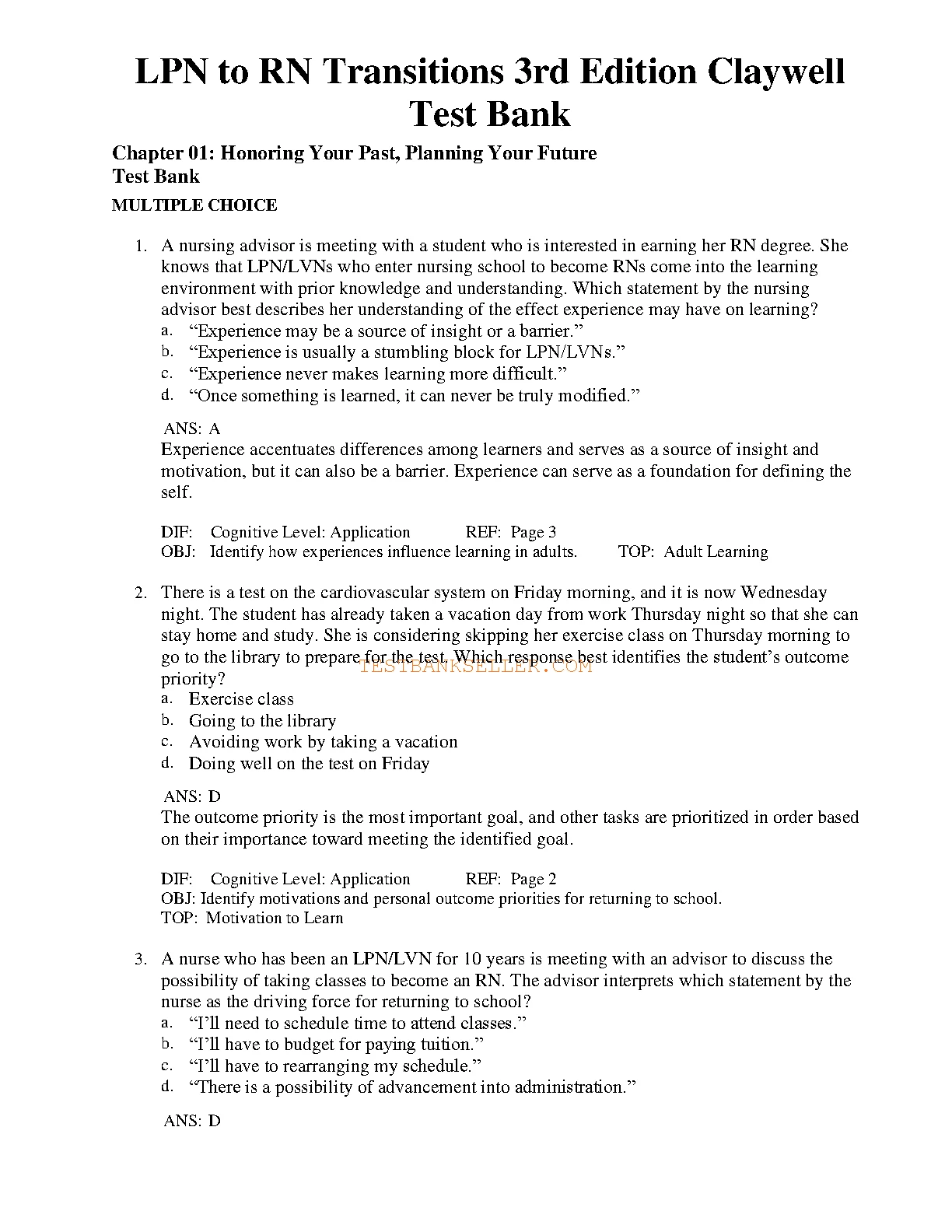 test bank for lpn to rn transitions, 3rd edition by lora claywell