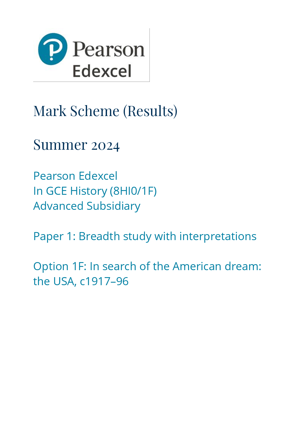 Pearson Edexcel GCE History PAPER 1 MARK SCHEME 2024 (8HI0/1C). Pearson Edexcel GCE History PAPER 1 MARK SCHEME 2024 (8HI0/1C) Pearson Edexcel A and AS Papers and Mark Schemes