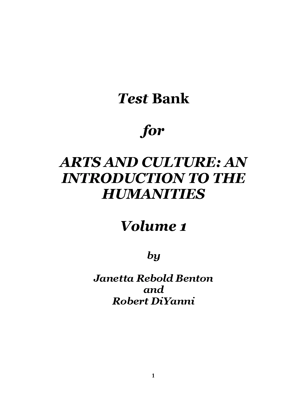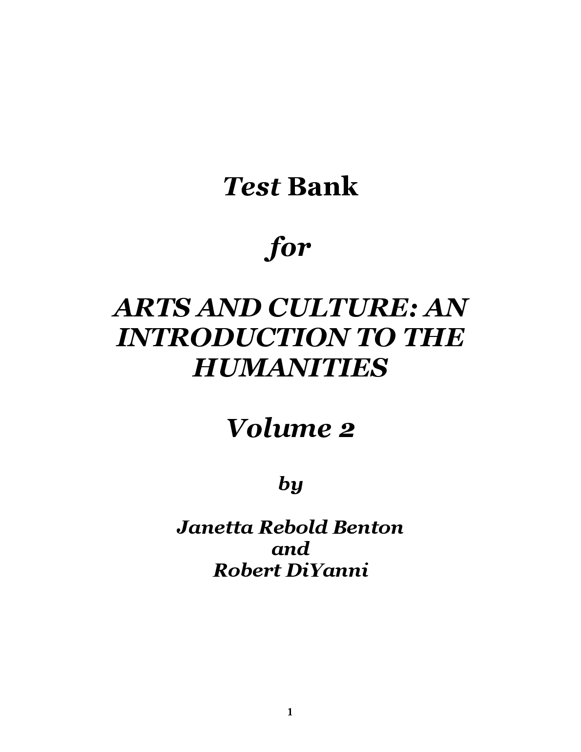Test Bank for Arts and Culture An Introduction to the Humanities, Combined Volume, 4th Edition by Janetta Rebold Benton Robert J. DiYanni. Test Bank for Arts and Culture An Introduction to the Humanities, Combined Volume, 4th Edition by Janetta Rebold Benton Robert J. DiYanni TEST BANK