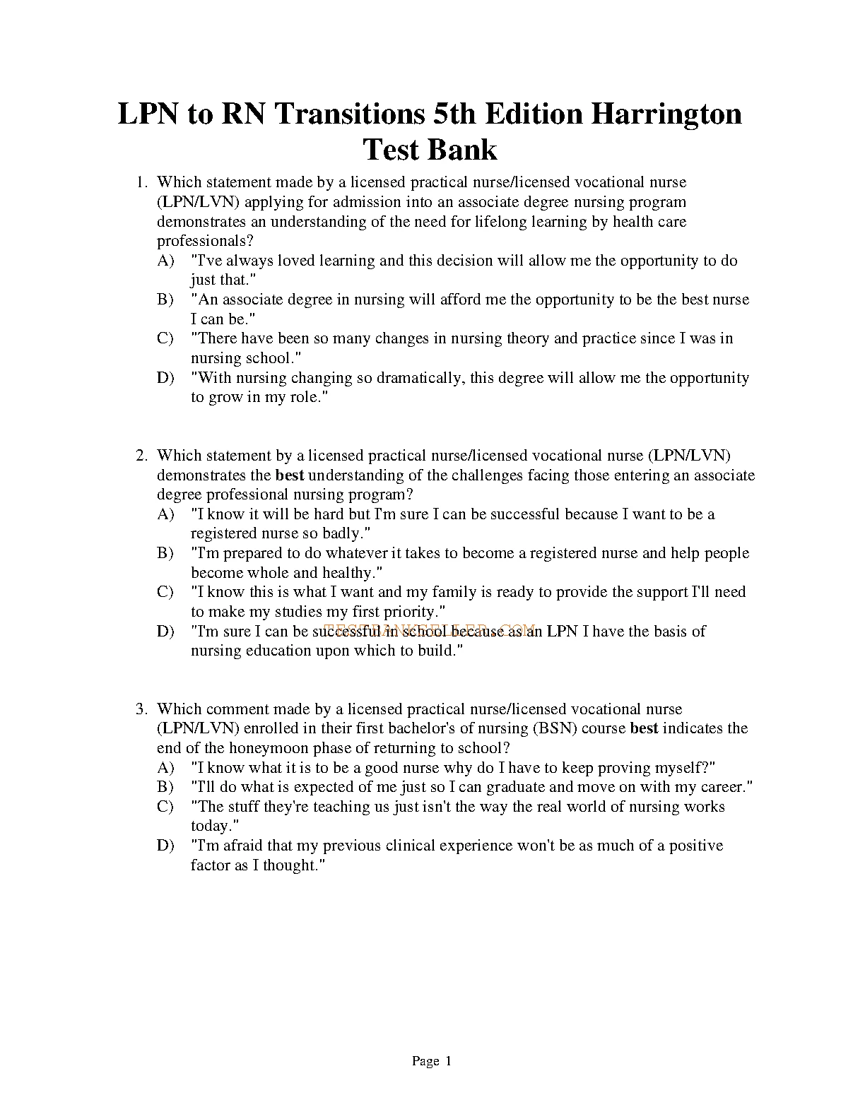 Test Bank For LPN to RN Transitions 5th Edition by Nicki Harrington, Cynthia Lee Terry. Test Bank For LPN to RN Transitions 5th Edition by Nicki Harrington, Cynthia Lee Terry TEST BANK