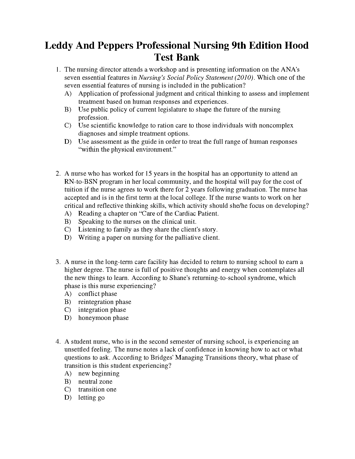 Test Bank For Leddy And Peppers Professional Nursing 9th Edition by Lucy Hood. Test Bank For Leddy And Peppers Professional Nursing 9th Edition by Lucy Hood TEST BANK
